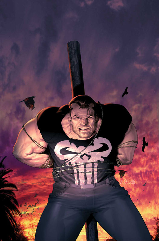 With the echoes of last issue's tragic ending still rattling in his head, Frank Castle finds himself tied to a fencepost with barbed wire, watching what may be his last sunrise. Somewhere along the U.S./Mexico border a super-militia bent on igniting a race war has been killing scores of innocent people. By the time the last shot is fired and the last body falls, you'll have met the modern incarnation of the HATEMONGER and seen an all-new look for the Punisher.