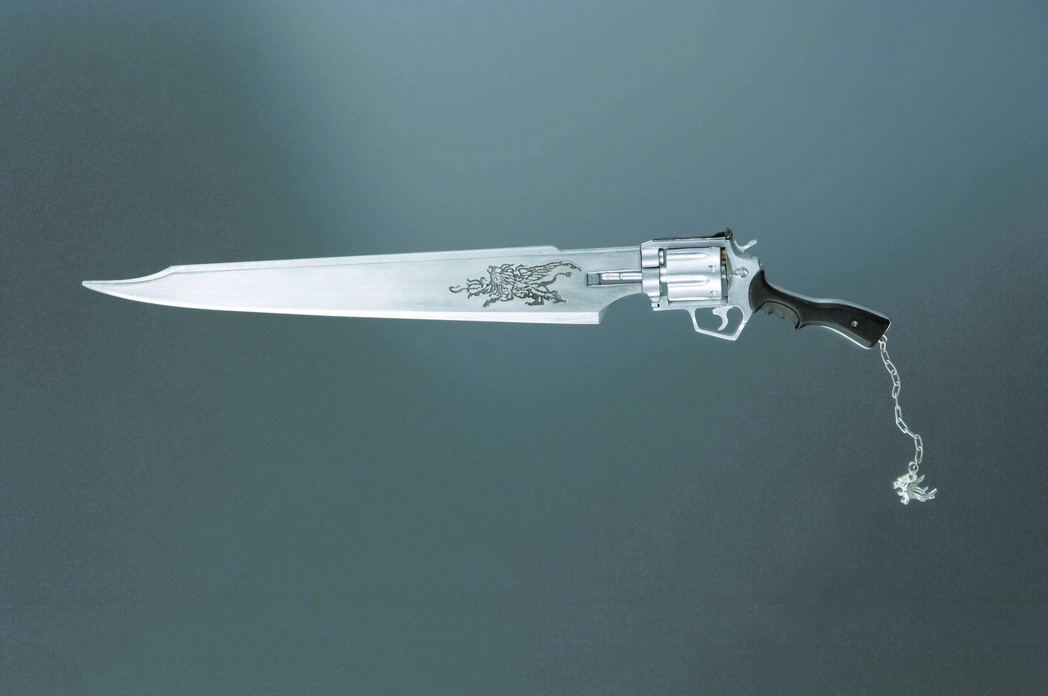 Squall's GUNBLADE is scheduled to have an opening cylinder, a hammer that can be cocked, and functioning trigger. The "Revolver" Gunblade is embellished with the GRIEVER symbol on both sides of the blade, and also on a chain as an icon pendant.