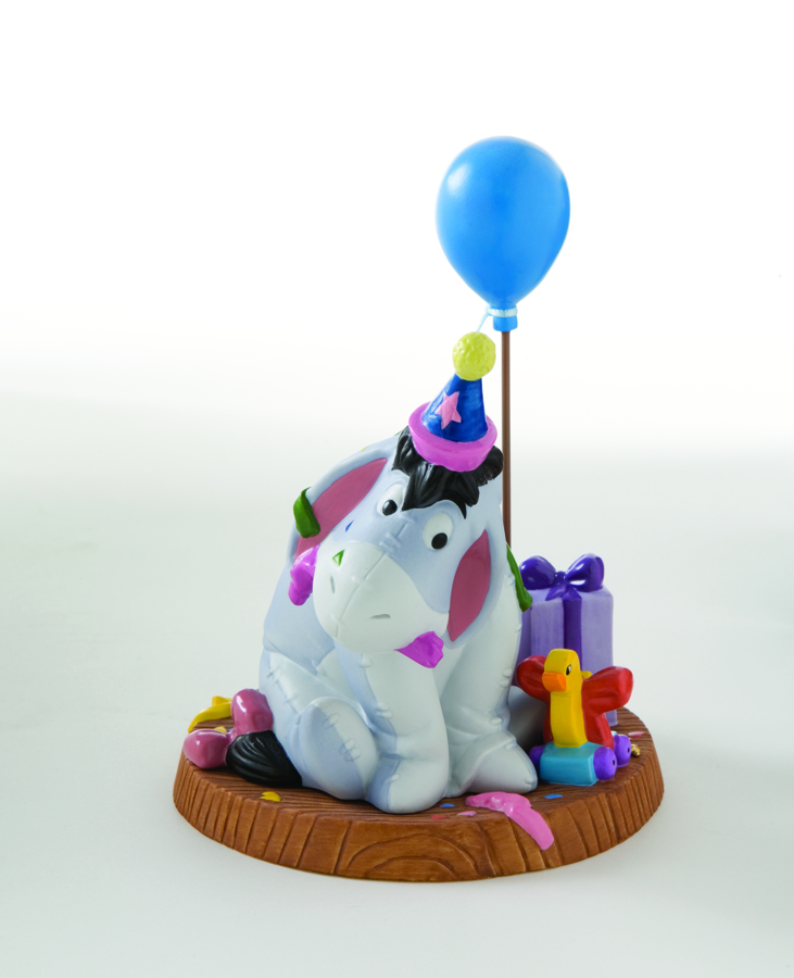 Pooh & Friends, the Gift of Friendship in fine bisque porcelain. Piglet blows bubbles for a birthday surprise in "A Bubble is Like Wrapping Paper for Wishes" (3 1/2" tall). It's congratulations time from Tigger with "You're Tiggerific" (6 1/4" tall), greeting card included. Finally, Eeyore comes decked out for a birthday with a balloon when "A Celebration is in Store" (5 3/4" tall). Each handcrafted figure comes with an unique year production mark and a 14k gold plated charm.