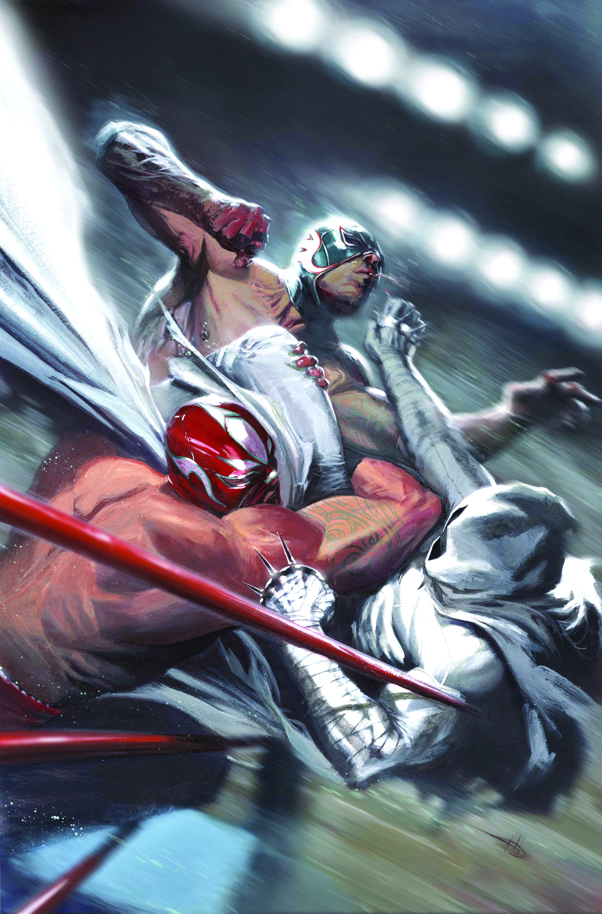 "DOWN SOUTH," PART 3-Let's get rrrrrrrreaaaaaaaaady to rrrrrruuuuuummmmmmblllllle!!! Playing protector to a young woman who's in the crosshairs of the meanest, craziest, most indefatigable bounty hunters south - or North - of the Rio Grande. Meet Los Bros Zapata, a tag-team Mexican wrestler duo who moonlight as assassins, and who'll do anything - anything - to take down their mark. Moon Knight's gonna have his hands full, but luckily, he's got someone in his corner: The Punisher.