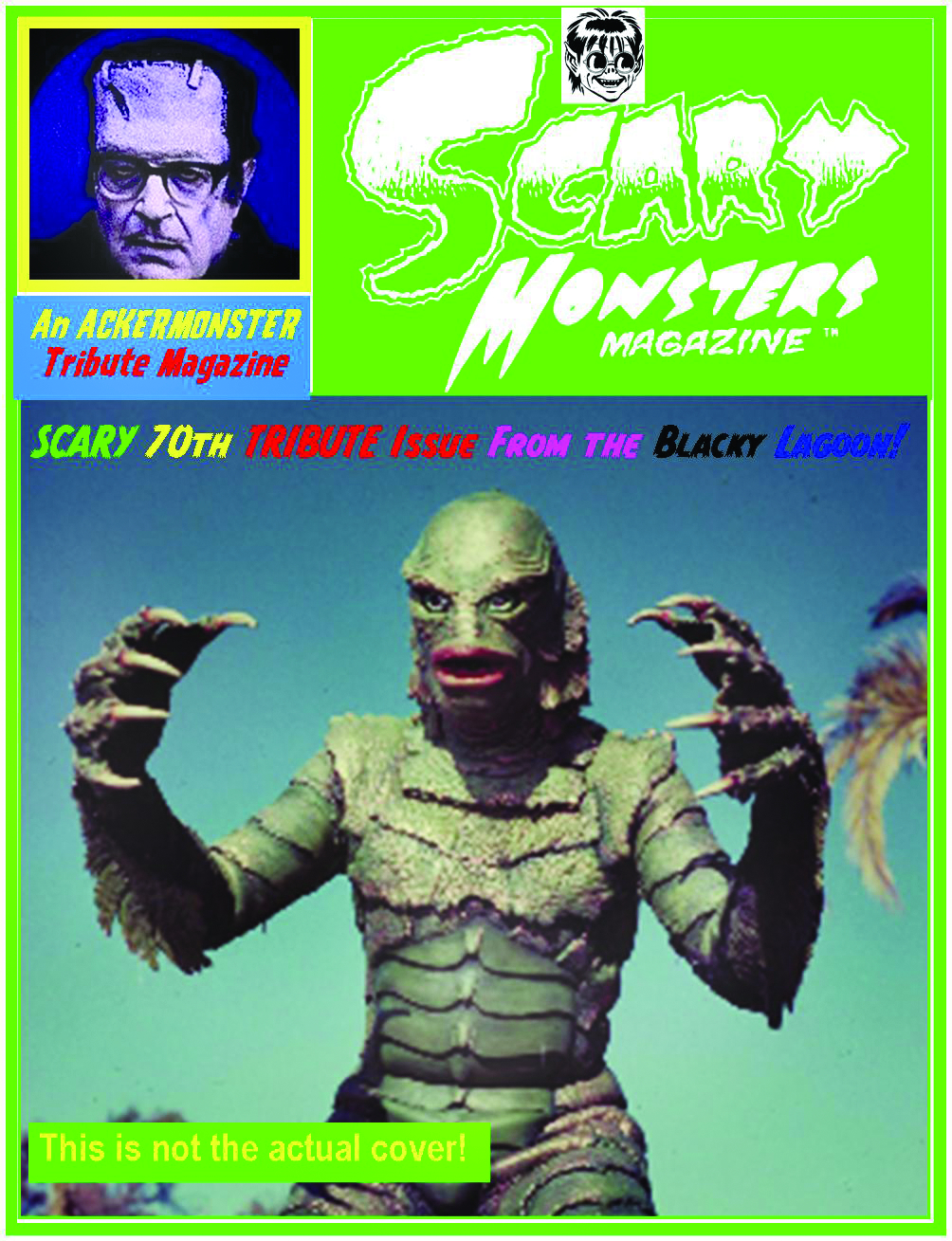 The Creature From The Black Lagoon has left an indelible mark on motion picture history. The "Scary 70th Tribute Issue From the Blacky Lagoon!" will remember Ben Chapman and the Creature with a special article that also features Ben's last interview. Besides paying tribute to Ben with the article/interview, we also pay tribute to the Founding Father of monster magazines, the late Forrest J Ackerman. Fans and colleagues will share their Monster memories, tributes, photos, and drawings of Uncle Forry, the co-creator of