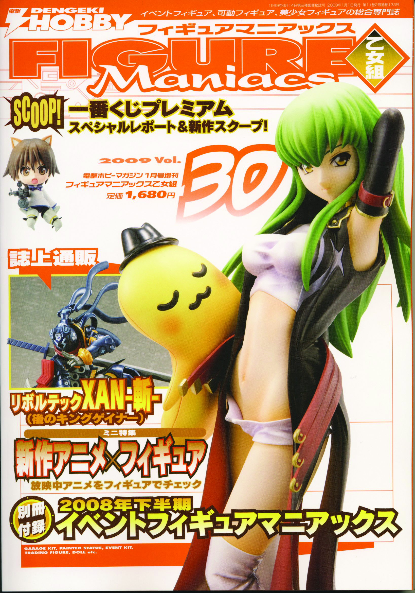 Figure Maniacs! Beautiful girls take center stage with new figure designs from some of the newest anime series to hit Japanese television. The issue also contains, as a special bonus, a booklet that profiles some of the convention-exclusive figures released in 2008. Japanese text.