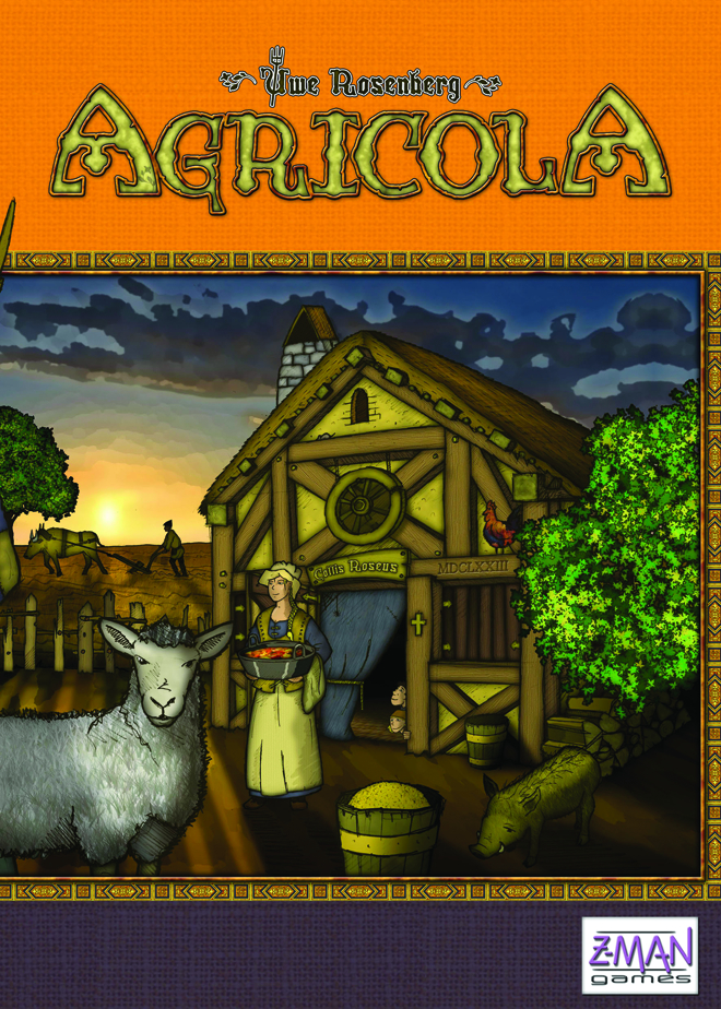 Agricola (Latin for "farmer"), you're a farmer in a wooden shack with your spouse and little else. On a turn, you get to take only two actions, one for you and one for the spouse, from all the possibilities you'll find on a farm: collecting clay, wood or stone; building fences; and so on. You might think about having kids in order to get more work accomplished, but first you need to expand your house. Or maybe you should learn a new trade? And what are you going to feed all the little rugrats? Have the best farm and household at the end of the game to win!