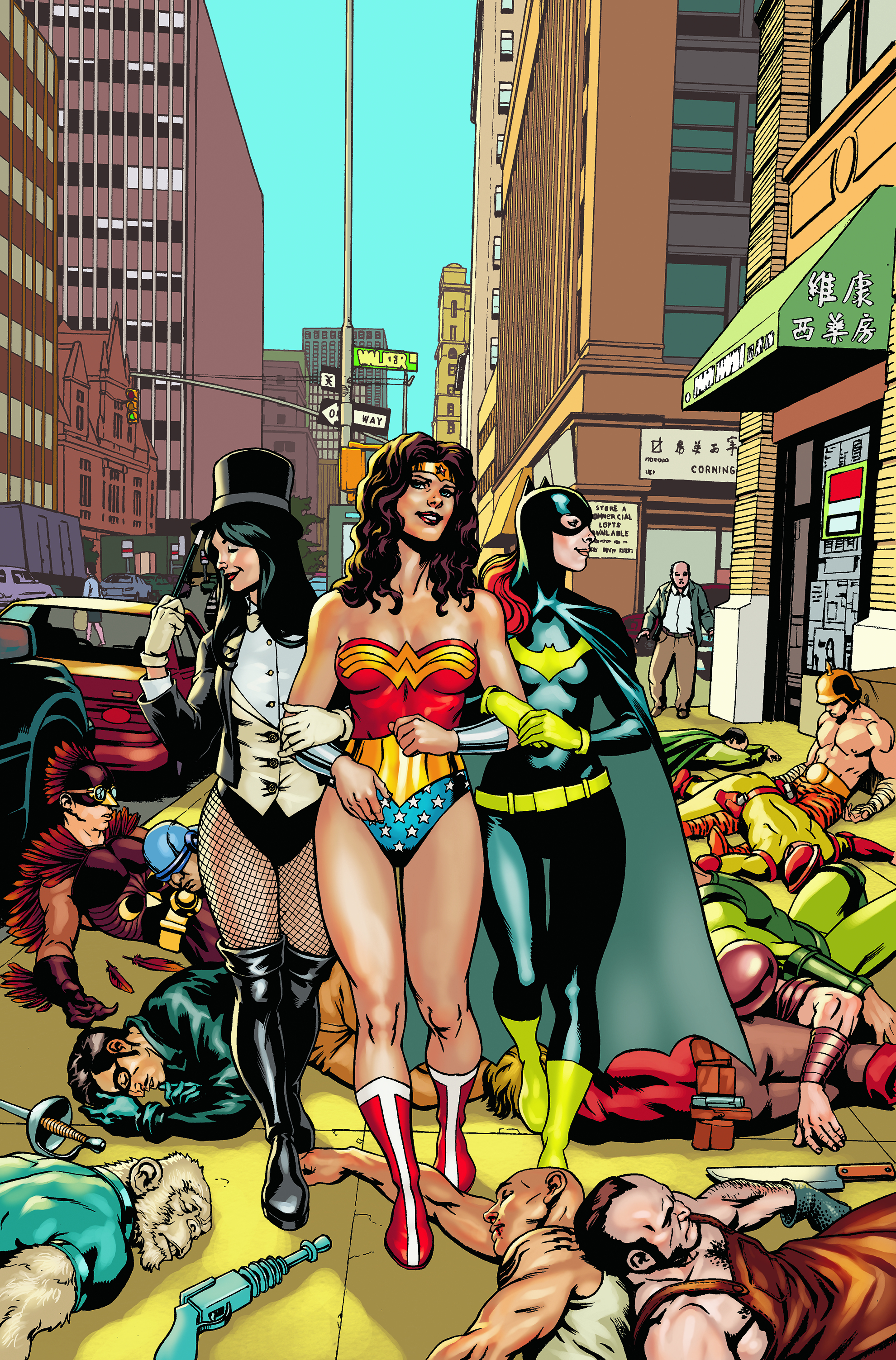 Oh yes, it's ladies' night! Batgirl, Wonder Woman and Zatanna enjoy a nice, peaceful evening on the town that absolutely won't be interrupted by any kind of superheroic hijinks whatsoever... and if you believe that, there's a giant bronze globe in Metropolis we'd like to sell you!