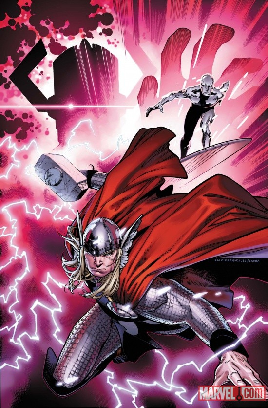 It's a shining, golden, new age for the Thunder God and Matt Fraction and Olivier Coipel are back to lead the charge! Thor and Sif dive deep into the heart of the fractured World Tree to reclaim an artifact from beyond time and space, an artifact that attracts the attention of the Silver Surfer. And when a herald such as he arrives on Earth, the arrival of his master is certain to follow. Prepare for the return of the World Eater...prepare for the return of Galactus! Fans can't miss an all new behind the scenes look at the highly anticipated major motion picture with a sneak peek at some of the art!