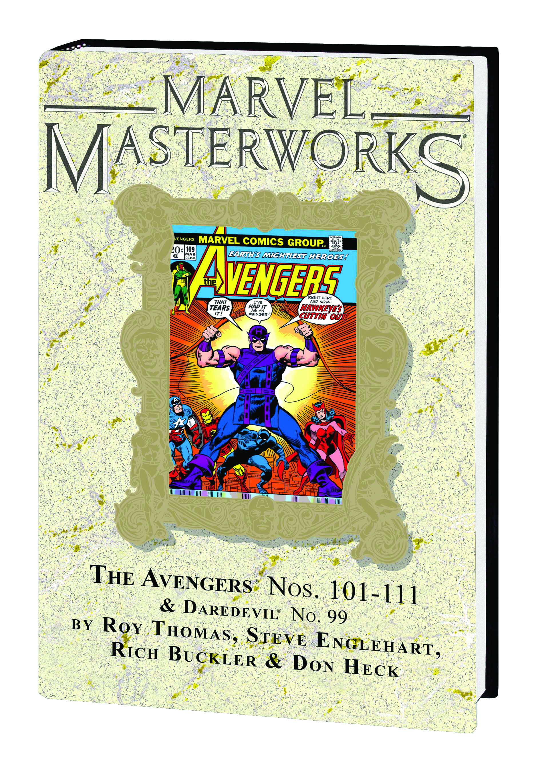 Avengers Assemble! Back in another beautifully restored MARVEL MASTERWORKS edition, Cap, Iron Man, Thor and the gang present another set of trendsetting adventures! Starting off with an intriguing Harlan Ellison adaptation, there's no time wasted upping the ante when the mutant-hunting Sentinels return from the heart of the sun. Then, the order changeth! After six years as writer of Earth's Mightiest Heroes, Roy Thomas passes the torch to the new scribe who would take the super-team to even loftier heights. Enter: Steve Englehart! Without skipping a beat, he descends into the time-lost Savage Land and brings back the Black Panther - all the while devising the machinations of the Grim Reaper and the Space Phantom that cruelly twist the Vision to their will. The tension peaks when Hawkeye quits, and the mutant menace Magneto takes out not just the Avengers, but the X-Men, too. Toss in Daredevil and the Black Widow, and what we've got here is an epic in the Marvel manner. So reserve that copy today, True Believer! Collecting THE AVENGERS #101-111 and DAREDEVIL #99.