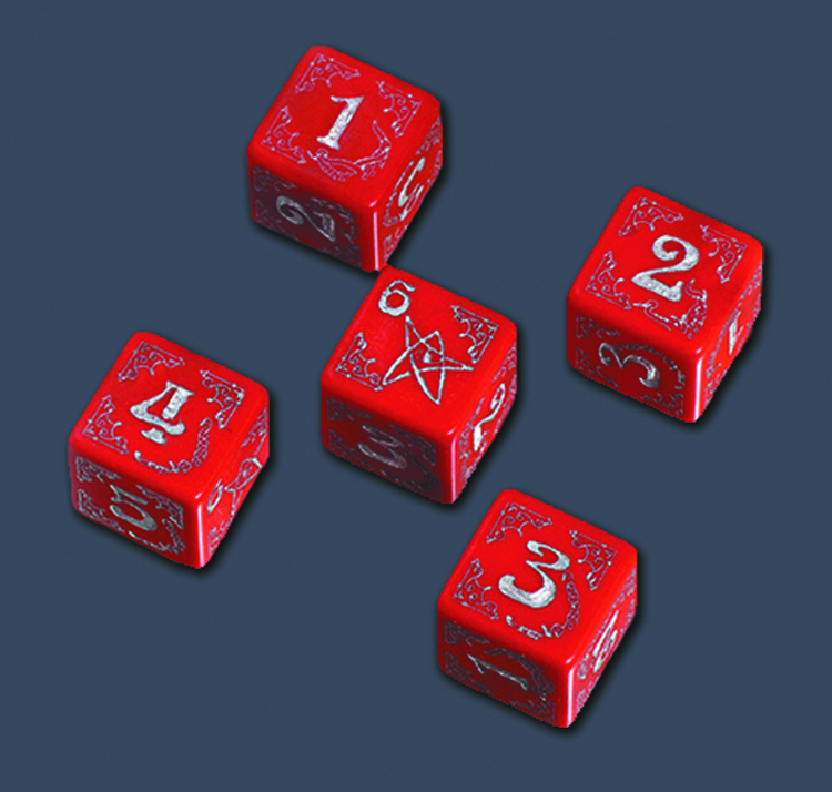 Prepare yourself for a new weapon in the ongoing fight to keep the streets of Arkham safe! Each Arkham Horror Dice Set contains five high-quality, crafted, polyhedral dice for use in Arkham Horror. These attractive dice are cast from hand-carved original sculpts and feature ornately detailed faces. The Base black dice display Elder Signs (to indicate successes) on the "5" and "6" sides, while the blue Blessed Dice show them on the "4," "5," and "6," and the red Cursed Dice limits success to only the "6."