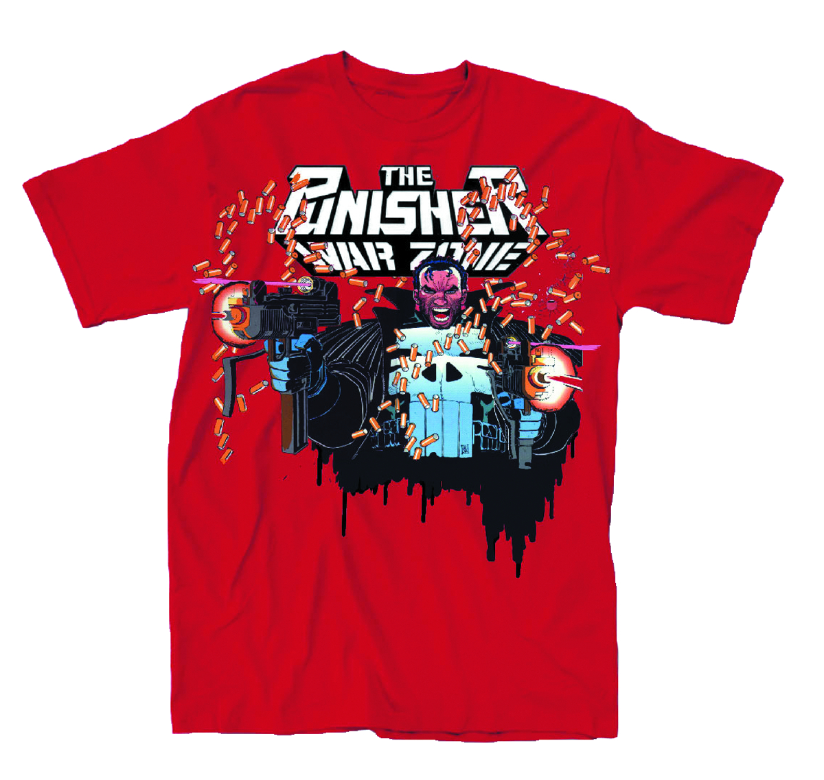 John Romita, Jr.'s cover to The Punisher War Zone #1 is reprinted on this red t-shirt!