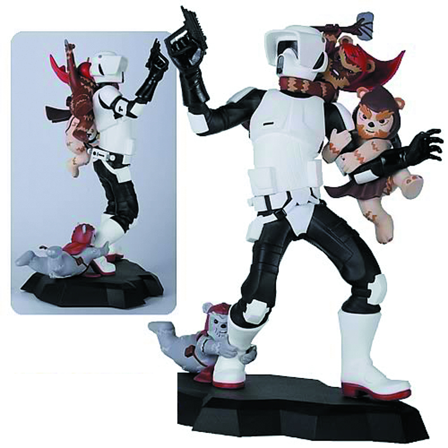 A Gentle Giant Sculpt! The Empire's finest, on the run from Endor's furriest! On the forest moon of Endor, the Imperial base was protected by the Scout Troopers. Mounted on their speeder bikes, these troopers patrolled the wild woods of the forest moon, occasionally falling prey to the native Ewoks. This statue from Gentle Giant depicts a Scout Trooper in a hairy situation! Beset by two Ewoks, the Scout Trooper may not live to patrol another day! Standing 10" tall, the statue is cold cast in the highest quality polystone. Limited to 1,200 pieces, the maquette comes with a Certificate of Authenticity.