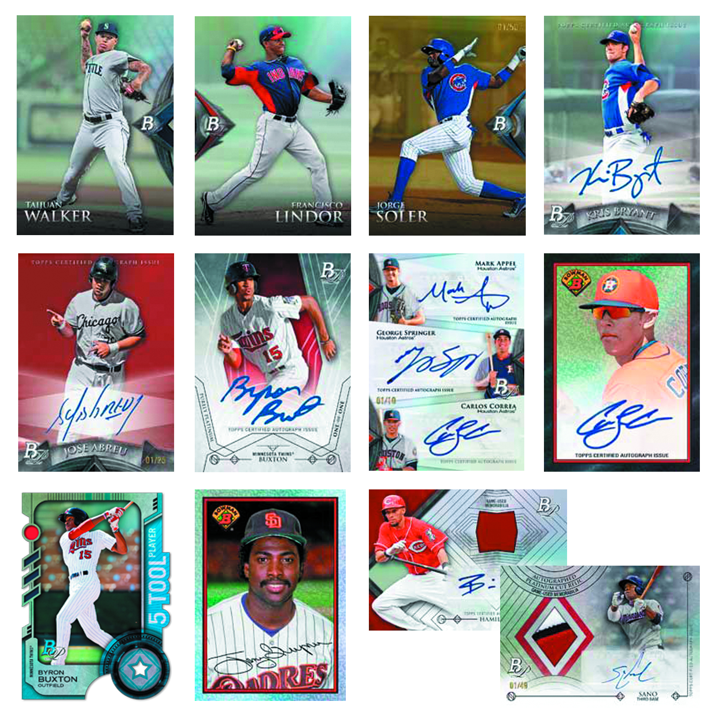 Bowman Platinum is a Prospector's "Midsummer Night's Dream"! This year's edition will be filled with Autographed Refractors and Autographed Refractor Relics or larger-than-life prospects from the 2014 class. There will be a new "Platinum Cut Autographed Refractor Relic" to chase this year. Bowman is also introducing a new, "Toolsy Die-cut", with unique die-cuts to represent all of the five differen baseball tools, with a 5-Tool parallel that will be the ultimate chase card! Every box will include two (2) autographed "Prospect Refractors" and one (1) "Refractor Autographed Relic". Plus, multiple levels and rarities of "Autograph Prospects", "Autographed Relics", Inserts, and a base set in multiple parallel levels featuring MLB's top Veterans and Rookies for 2014 on Rainbow Foil board! 5 cards per pack. 20 Packs per box.