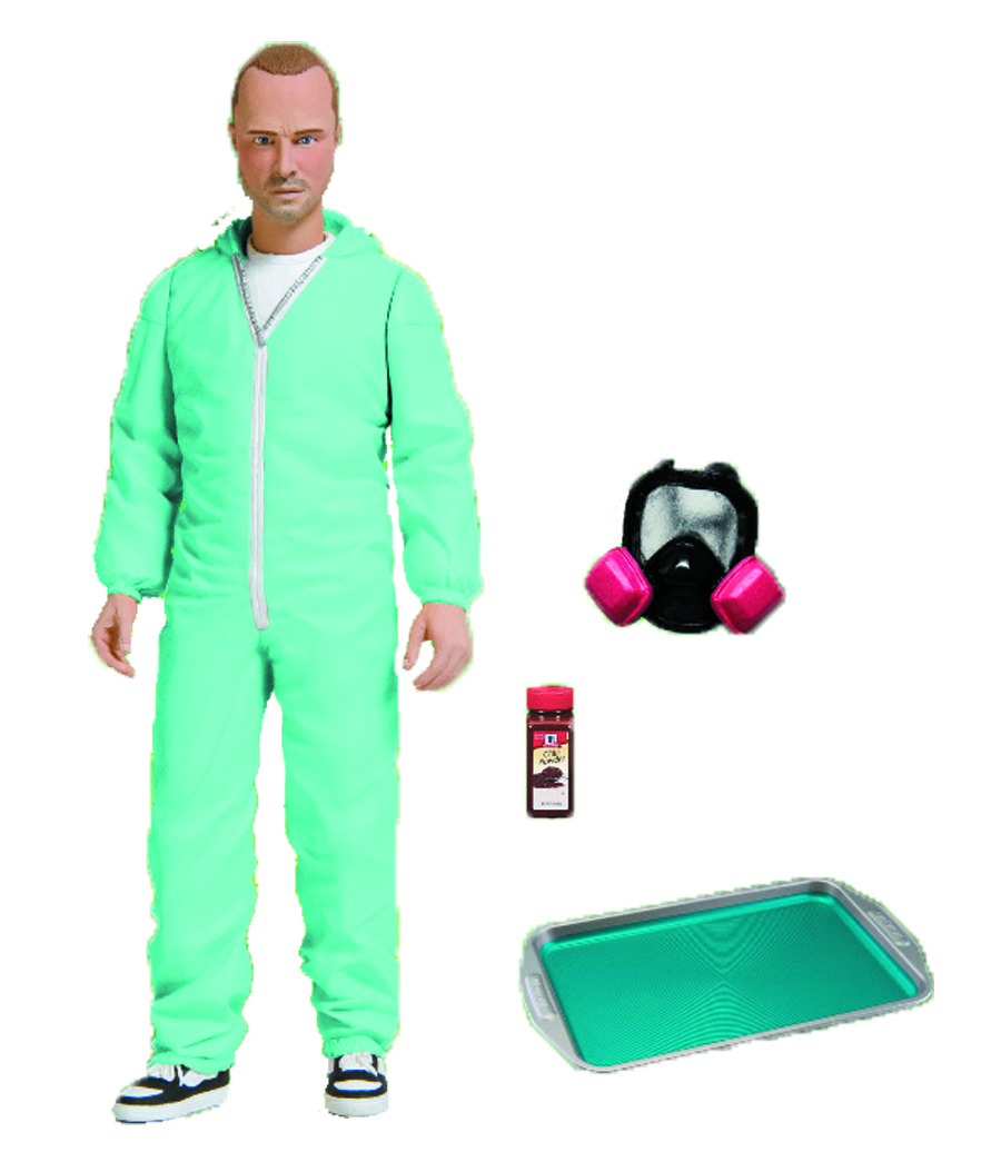 Breaking Bad. Jesse stands 6" H and he comes complete with a gas mask, chili powder, and a tray of blue crystal. The whole set is discreetly packaged on a collector-friendly blister card.