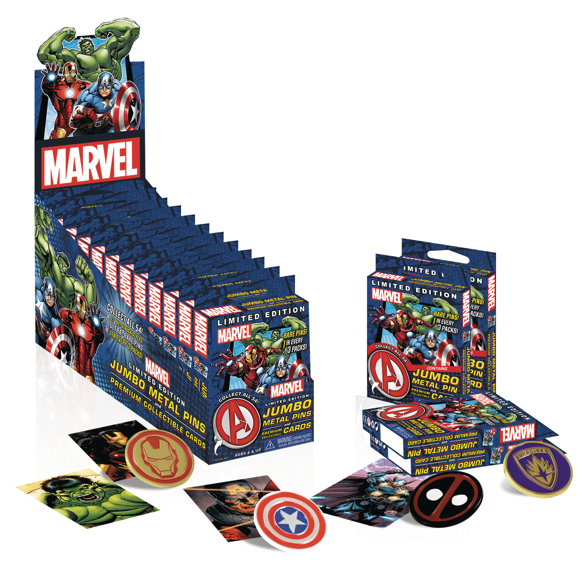 Each blind box includes one jumbo metal pin and one full-color, double-sided, premium collectible backer card for a character (or team) from the Marvel comic book universe. There are 27 fan-favorite characters in all, like SpiderMan, Captain America, Hulk, Deadpool, Doctor Strange, Iron Fist and many more! Pins measure approximately 1.5 inches. Some packs will contain a rare variant, such as an embossed pin, or a die-cut pin with special "comic book cover" card!