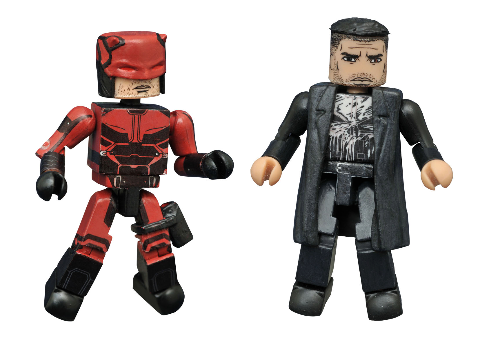 Daredevil, this exclusive two-pack of Minimates mini-figures features Daredevil and Punisher in their most recent on-screen looks! Matt Murdock, a.k.a. Daredevil (in his red costume), includes batons and an alternate hairpiece for an unmasked look, while Frank Castle, a.k.a. the Punisher, comes with multiple weapons for bringing the fight to the criminals! Each Minimates mini-figure measures 2" tall and features 14 points of articulation. Packaged in a full-color window box!