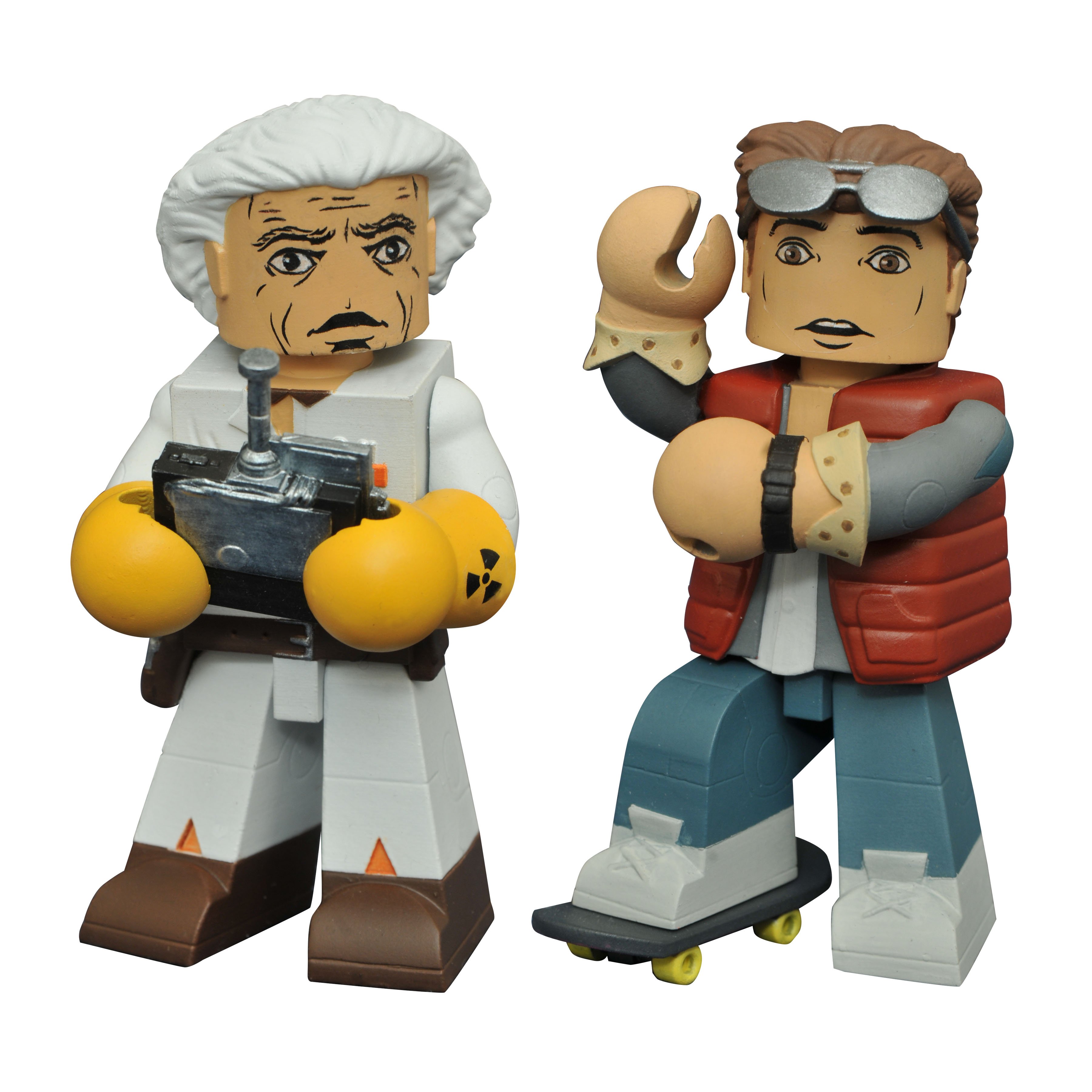 Back to the Future film are sculpted in the Minimates block-figure style, wearing their classic outfits and striking poses straight from the movie. Both feature articulated necks for further posing options. Each comes packaged in a full-color window box.
