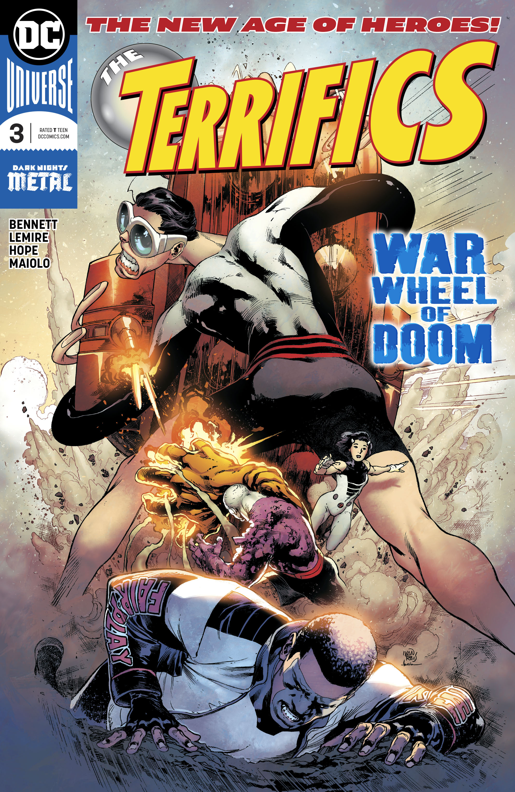 "MEET THE TERRIFICS" part three! When will this superhero team bound by dark multiversal magic ever get any privacy? It certainly won't be today, because while Mr. Terrific feverishly works to free himself from Metamorpho, Plastic Man and Phantom Girl-but mostly Plastic Man-the team must also contend with the towering, rolling death-inferno that is the War Wheel.