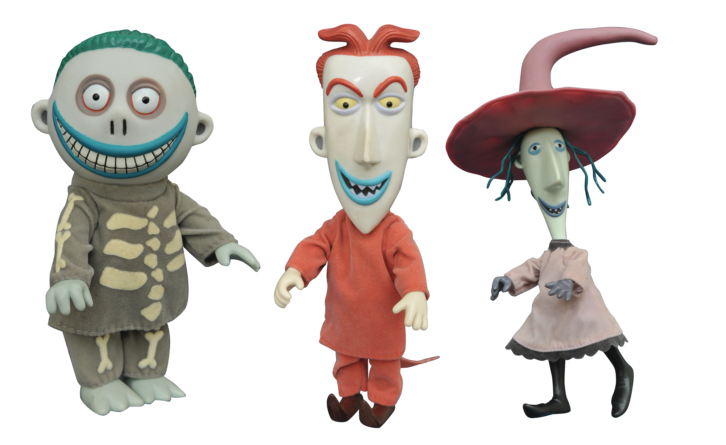A Diamond Select Toys Release! The Nightmare Before Christmas Deluxe Collection is back, and it's more deluxe than ever before! Two new releases take the line into new territory, with Snowman Jack - who includes a removable snowman costume, with hat and umbrella - and Lock, Shock and Barrel, the line's first three-pack, with removable hat and masks! Each cloth-costumed figure looks like it stepped off the movie screen, with multiple points of articulation. Lock, Shock and Barrel measure approximately 5 inches tall, and Jack measures 16 inches tall with doll stand.