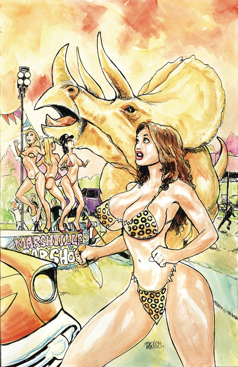 Join us at the county fairgrounds for the annual Marshville Car Show. The whole town turns up to enjoy the festivities: classic and custom cars and bikes, corn dogs, funnels cakes, and everyone's favorite, - the teeny bikini contest. It's the perfect summer day until a huge a triceratops crashes the party and as usual its up to Meriem and friends to stop the carnage! A very cool story along with 4 pages of truly awesome pinups of bikini girl contestants.