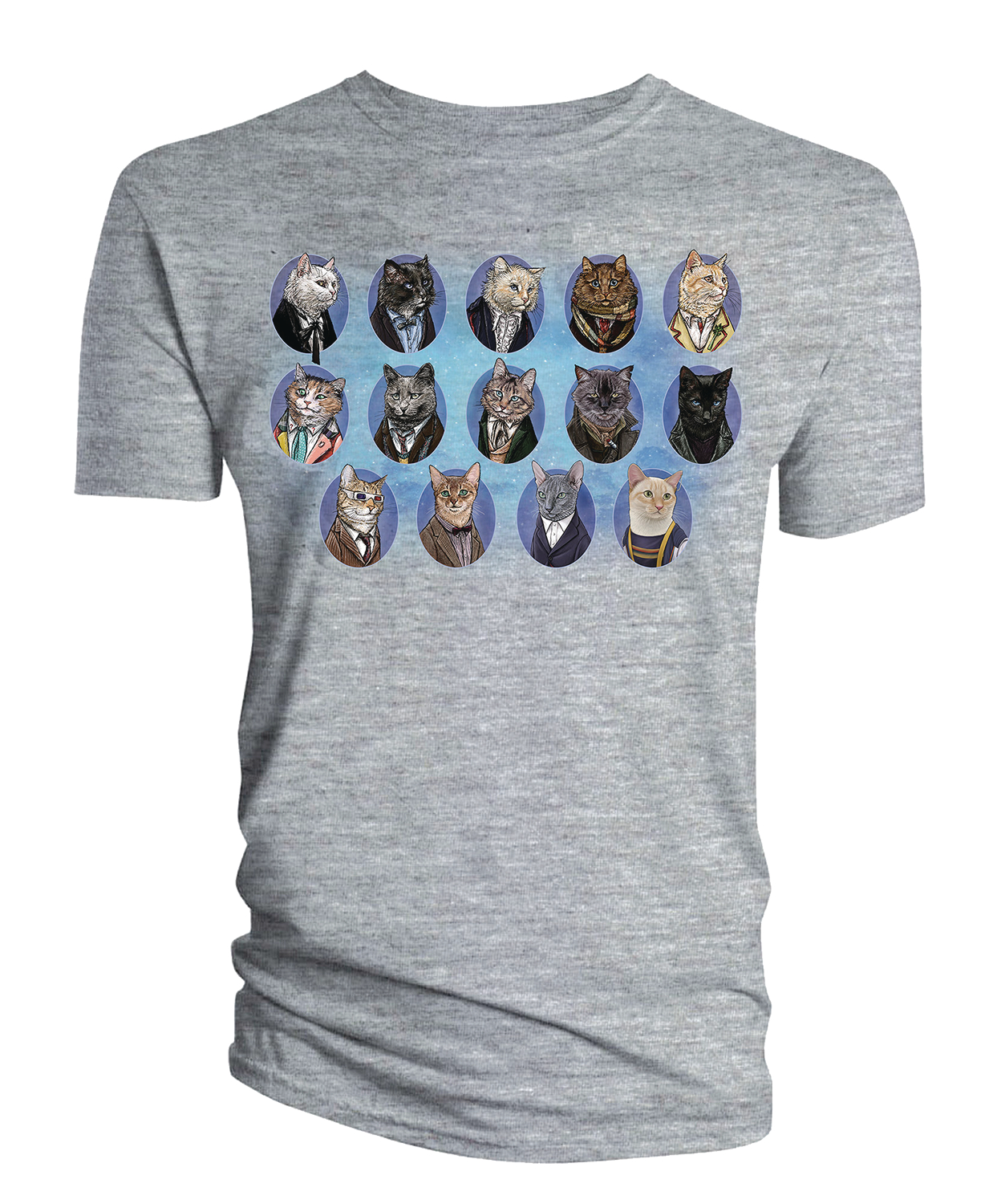 Jenny Parks' fan-favorite artwork of "Doctor Mew" - the fourteen Doctors of Doctor Who as cats - is printed on this gray t-shirt!