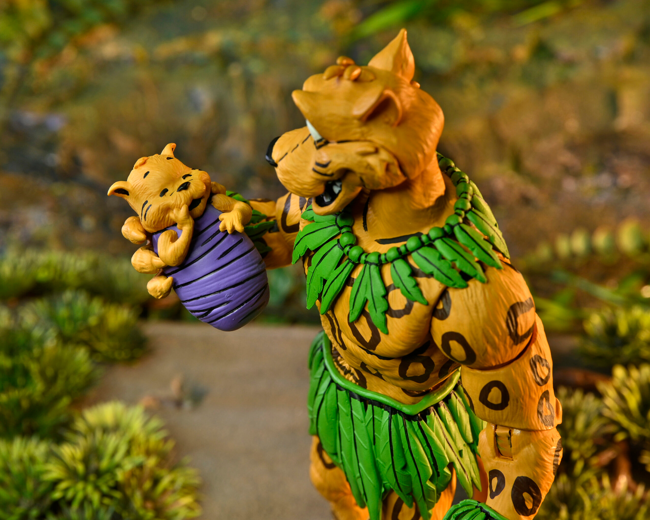 From NECA. It's an action figure first! This new action figure from NECA is straight from the pages of Eastman and Laird's Teenage Mutant Ninja Turtles Adventures comic book series from Archie Comics! Mighty Mutanimal Jagwar has been fully self-sufficient since he was 12, which you would expect from the son of the great Jaguar Spirit. He roams the rainforest, defending it against all who would destroy or defile it. This 7" scale figure is detailed as depicted in the comics, and includes extra head, extra hands, bowl of fruit, campfire, and baby Jagwar. Comes in collector-friendly window box packaging featuring all new illustrations by comic book artists Ken Mitchroney and Gary Fields.