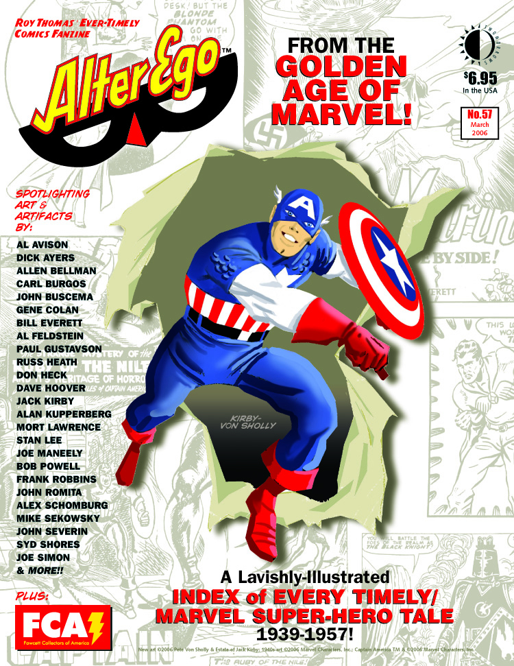 Captain America cover by Jack Kirby and Pete Von Sholly, a complete issue-by-issue index of Timely/Atlas/Marvel super-hero stories, and Gene Colan and Allen Bellman on the 1940s Timely super-heroes, this issue is not to be missed.