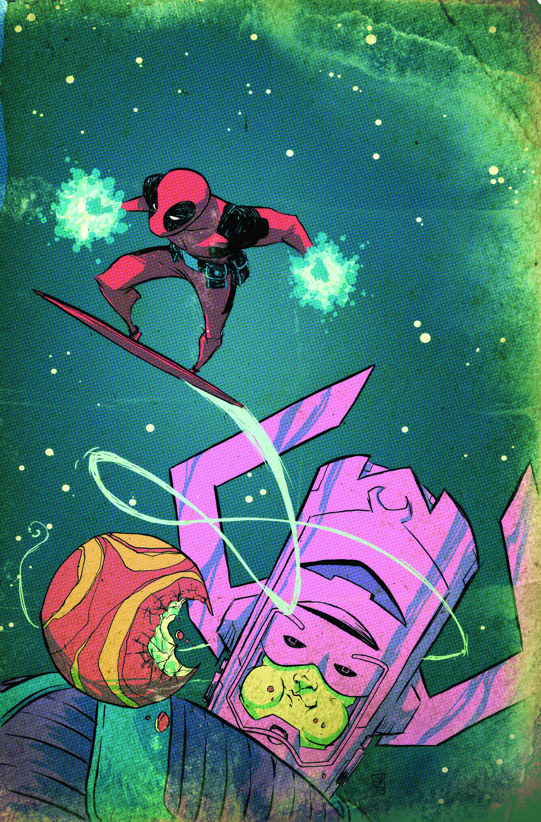 The country is in the middle of an economic meltdown and everyone is feeling the burn, especially your favorite Merc with a Mouth. Deadpool realizes that there's no government bailout for super-powered mercenaries and when clients stop paying up, he's forced to do the unthinkable... Look for a job. Luckily, Galactus has a position open in the Herald department. Don't miss the face-melting final issue of the series that shook the comic book world to it's very core.