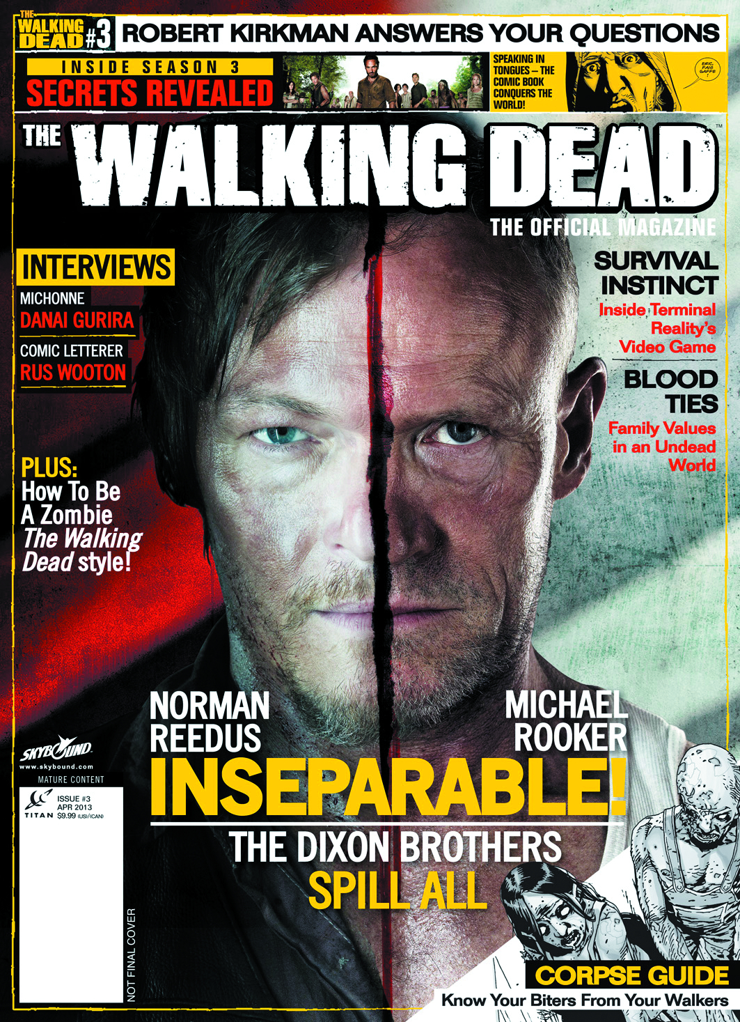 Issue #3 is all about the importance of "family" in a zombie-infested world, from Rick's dedication to his son, Carl, in the comic book to the more fractious relationship between rival siblings Darryl and Merle Dixon (Norman Reedus and Michael Rooker, both of whom are interviewed in this issue) in the TV series. Also, Robert Kirkman will answer more readers' questions; letterer Rus Wooton reveals all about working on the comic book; we prick up our ears to the music of Bear McCreary; we find out the latest news on the forthcoming Activision videogame; and we visit the set to learn what it takes to be transformed into a flesh-hungry zombie.