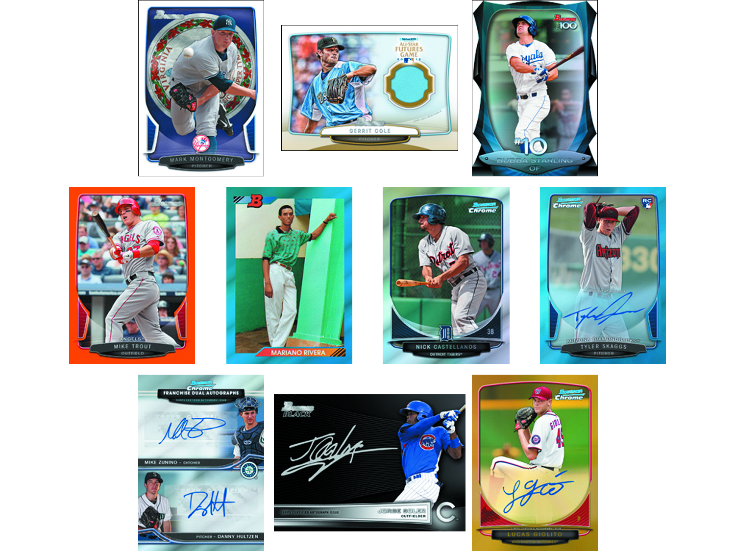 Bowman celebrates 65 years of baseball cards with 2013 Bowman Baseball with the Blue Sapphire Refractor program. The base set features both Veterans and Rookies with several levels of parallels, including State and Home Towns, Gold-Bordered, Blue-Bordered, Orange-Bordered, Red-Bordered, and Silver Ice. The top 100 prospects are featured in the Prospects subset, plus the "Cream of the Crop" of the diamond star in the Chrome Refractor cards. There are also Dual Franchise Refractor Autographs, Futures Game Relics, Ultimate Prospect Autographs, and the AFLAC/Perfect Game High School All-American autograph cards. 10 cards (5 Baseball, 2 Prospect, 2 Chrome Prospect, 1 Parallel) per pack, 24 packs per box. Also available in Jumbo Packs: 32 cards (16 Baseball, 8 Prospect, 6 Chrome Prospect, 1 Base Gold Parallel, 1 Bowman's Best) per jumbo pack, 12 packs per box.