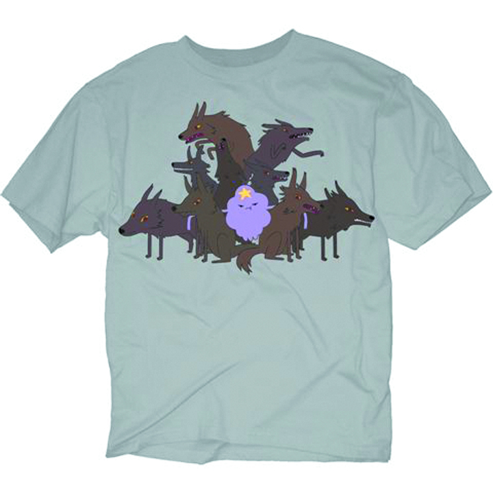 The Lumpy Space Princess and her lupine friends are gathered together on this silver t-shirt!