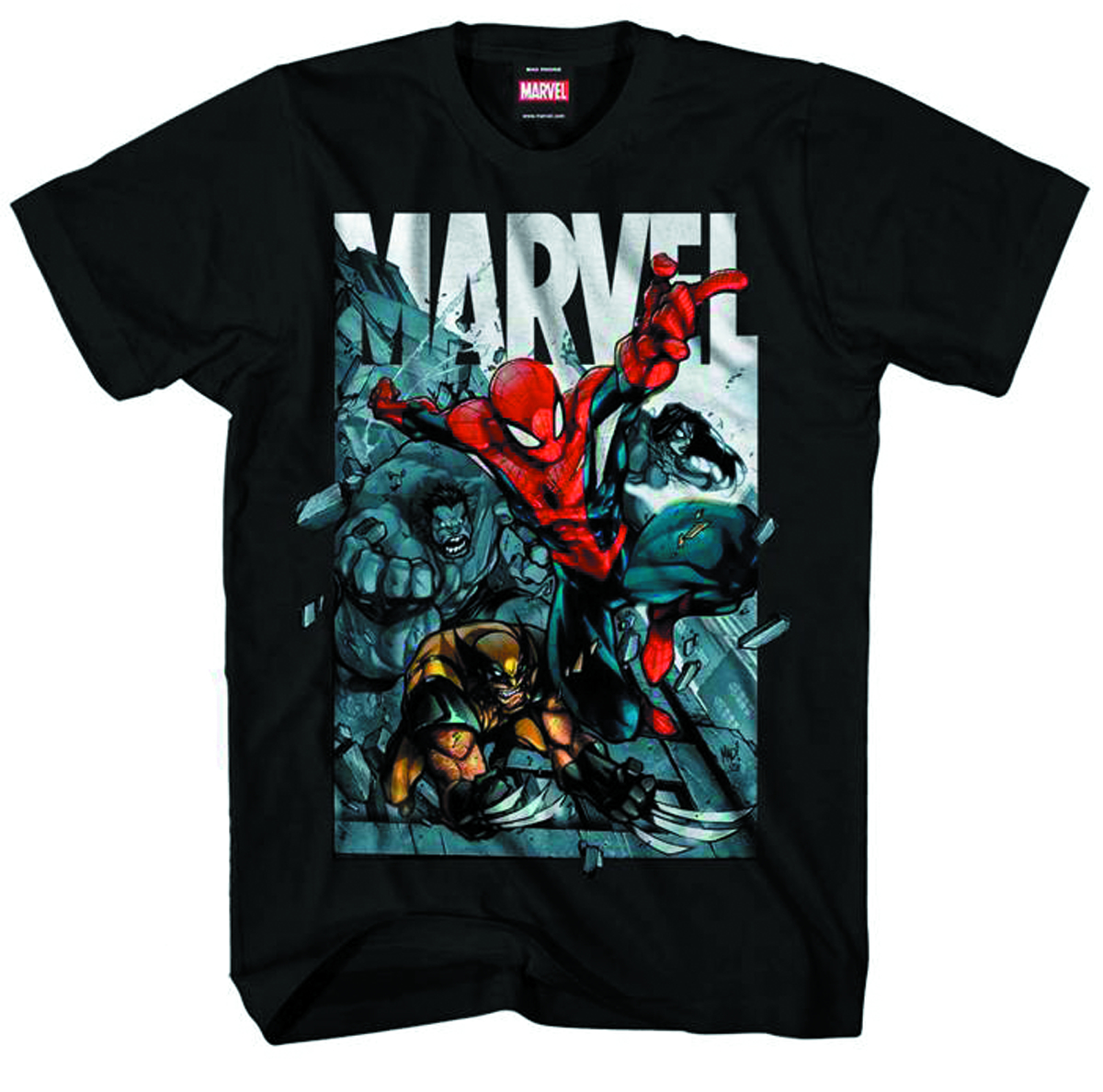 Spider-Man, Wolverine, and the Red Hulk are on the attack on this black t-shirt that reprints Joe Maduriera's cover to Avenging Spider-Man #1!