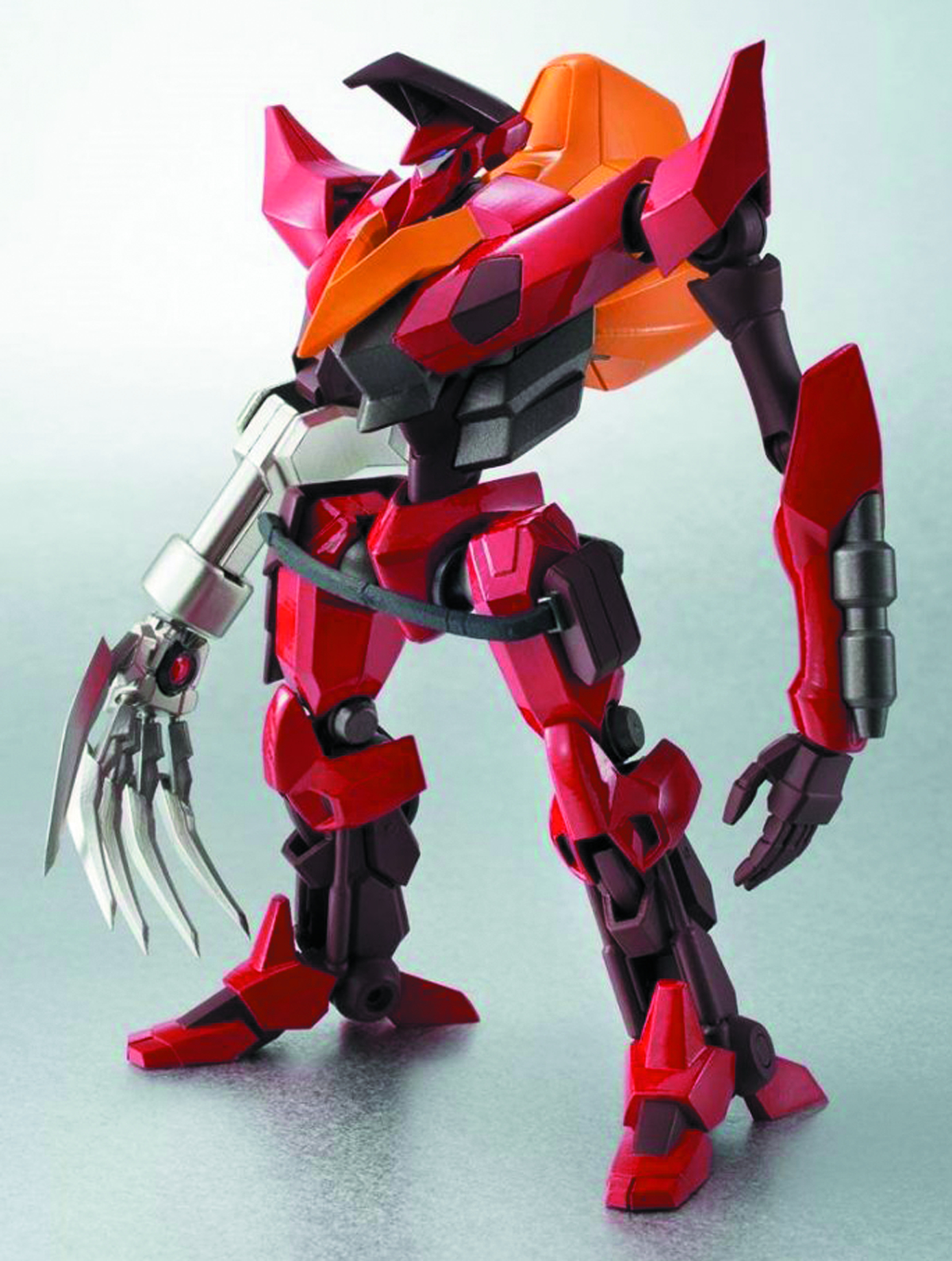 Robot Spirit series. This advanced robot action figure features a meticulous portrayal of the Knightmare Frame's radiant wave surger right arm weapon. The 5" tall figure set also includes a fork-shaped knife and Slash Harken accessories, as well as three sets of interchangeable hand parts. Window box packaging.