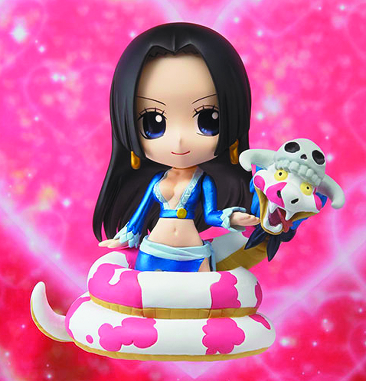 Boa Hancock rejoins the adorable and dynamic Chibi-Arts series wearing a blue dress with her pet Salome. A full array of accessory option parts are included for enhanced play value. A total of three different facial expression parts (smiling, bashful, and pistol kiss), special leg parts for seated pose, interchangeable arm parts, Salome, special display stand, and Japanese catchphrase quote with display stand. The figure stands nearly 4" tall. Window box packaging.