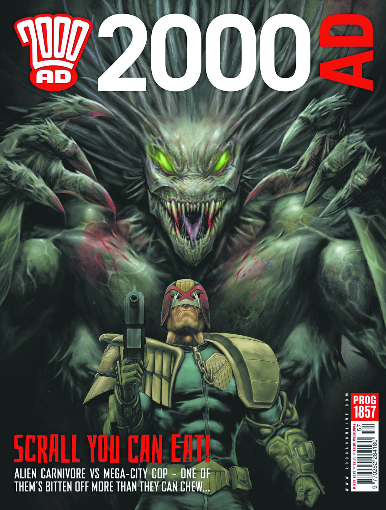 Outlier by T.C. Eglington and Karl Richardson; hitmen Sinister Dexter go offroad in the backwoods of Generica in "Gun Shy" by Dan Abnett and Smudge; and meet Atalia Jaegir of the Nordland State Security Police, trawling the underbelly of Nort society for war criminals and genetic outcasts, in "Jaegir" by Gordon Rennie and Simon Coleby!