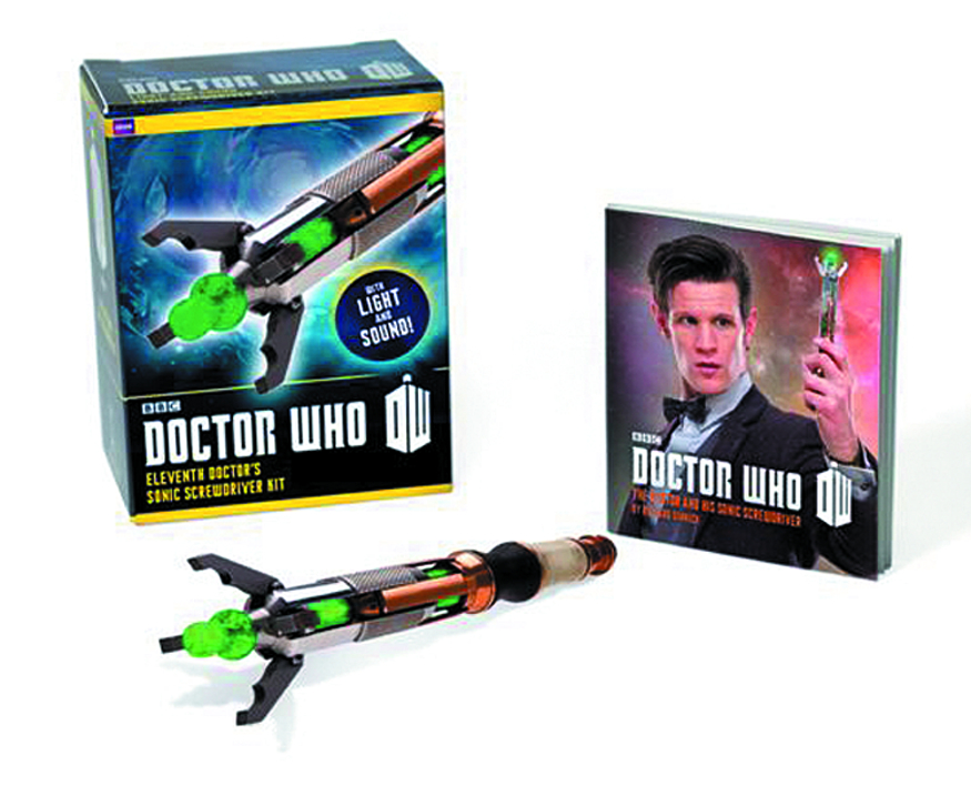 Doctor Who. It includes a replica of the Doctor's Sonic Screwdriver-with light and sound! The reeplica of the eleventh Doctor's Sonic Screwdriver includes light and sound, activated by a button. Batteries included. Plus, there's a 48-page book on the Doctor and his Sonic Screwdriver, featuring full-color photos throughout.