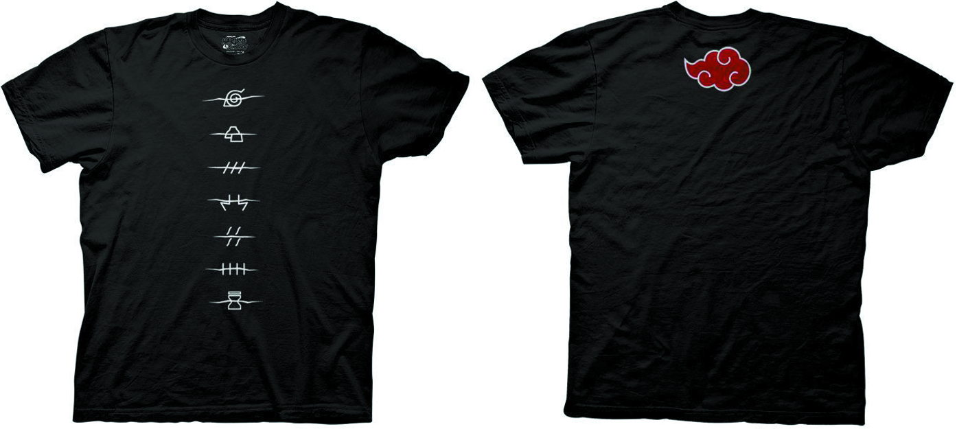 Symbols from the fan-favorite series Naruto are gathered together on this black t-shirt!
