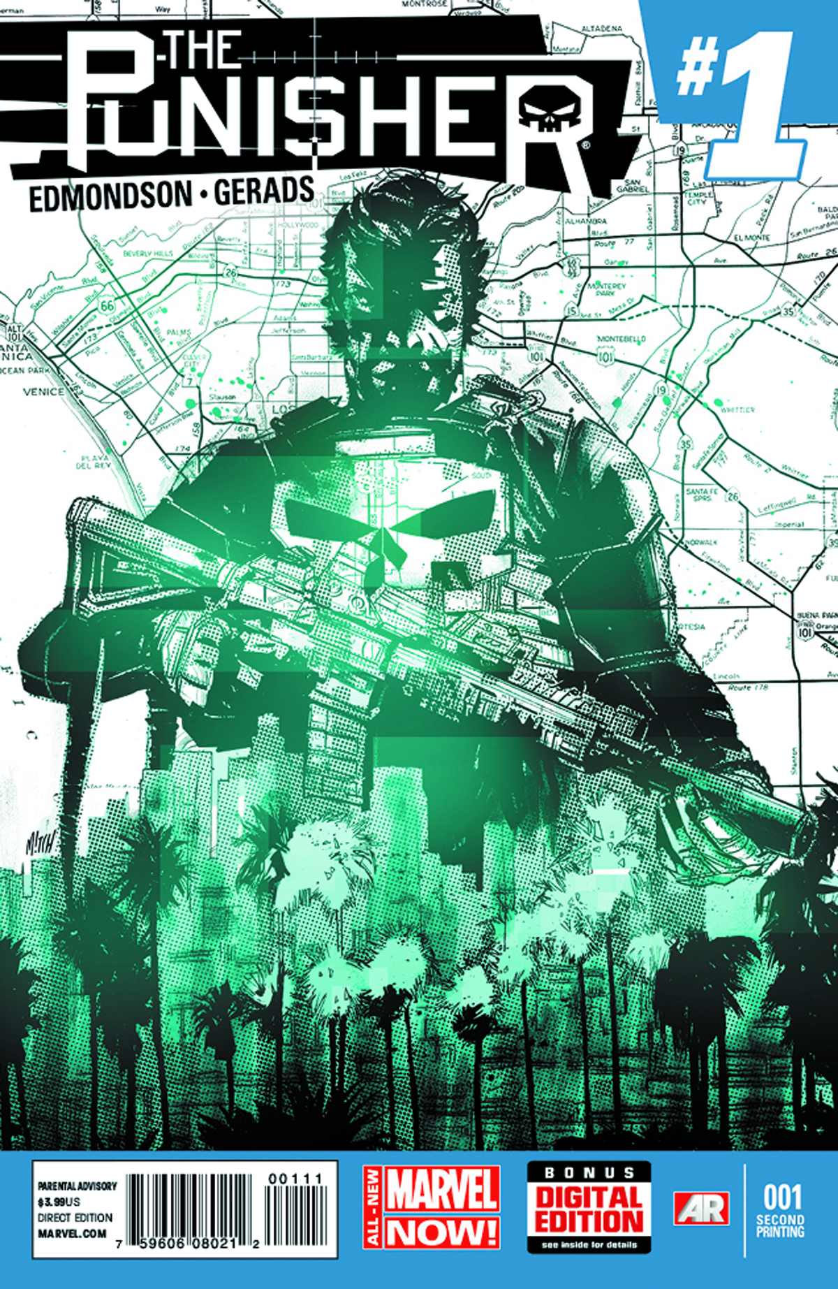 From Marvel Comics. For years, The Punisher has waged a war on crime in New York City with an array of very large guns, but a lead on a major source of drugs, weapons, and more has set his many sights due west. NOW! Frank Castle's in the City of Angels, looking to give the devil his due. Things aren't all they appear, though, with a highly trained military hit squad hot on Frank's tail. Caught between a posse of Punisher predators and targets of his own one-man-war, Frank's manifest destiny may be a shallow grave! Note: Offered originally in PREVIEWS Plus #1117.