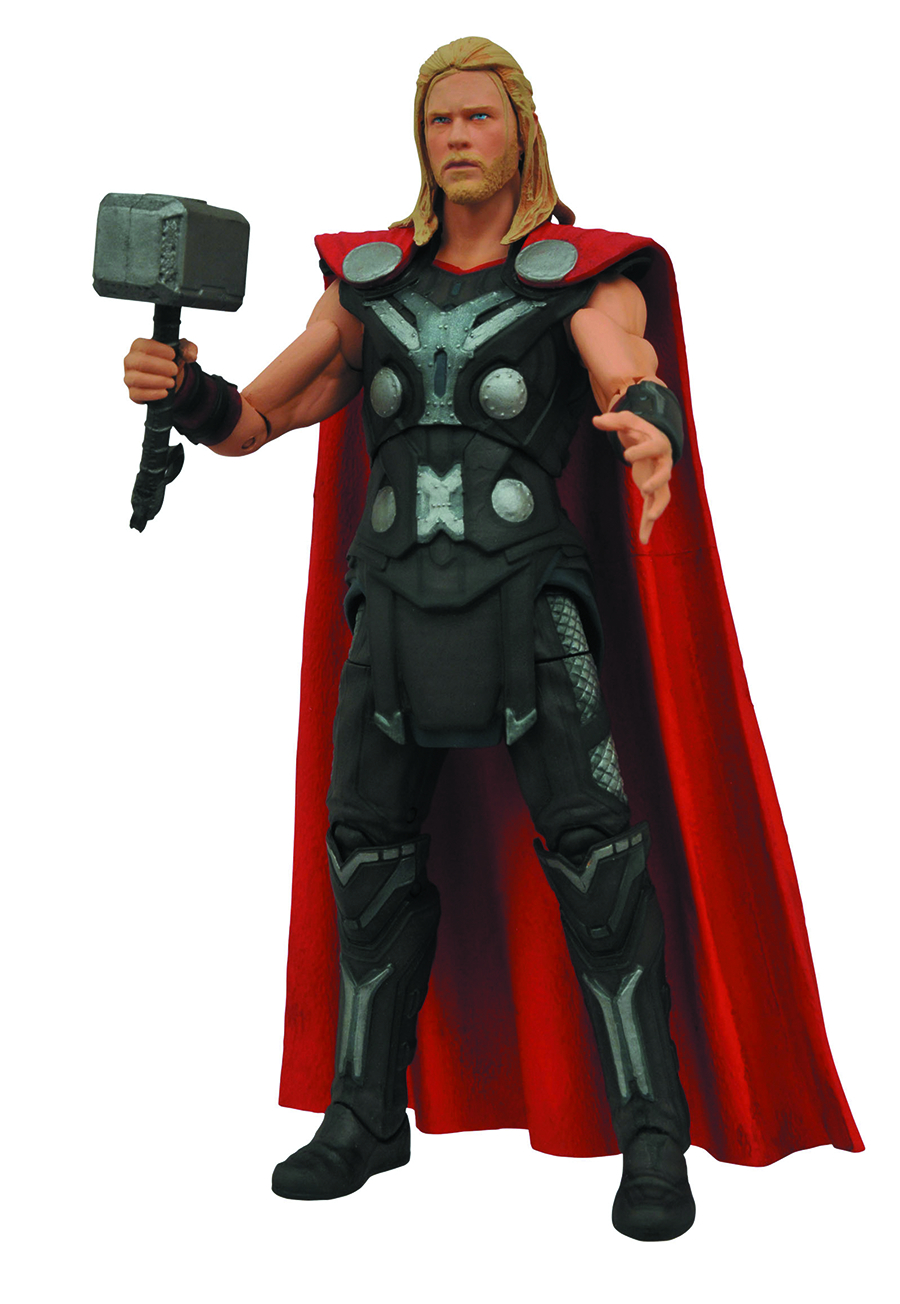 AA Diamond Select Toys release! It's time to put the hammer down! Thor, prince of Asgard, returns to Earth in "Avengers: Age of Ultron," and DST is revisiting their sold-out action figure from Thor: The Dark World with an all-new paint scheme and an all-new base! Standing almost 8 inches tall, this Thor figure sports 16 points of articulation and a spot-on likeness of Chris Hemsworth from the film, and comes packaged in Select-style display packaging, with spine artwork for shelf reference. Sculpted by Gentle Giant!