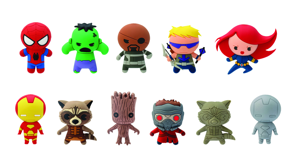 Star-Lord. There are also two chase figures for Rocket Raccoon and Iron Man. Each key ring is individually wrapped in a blind bag so each package is a delightful suprise! Organize your keys with Marvel style!