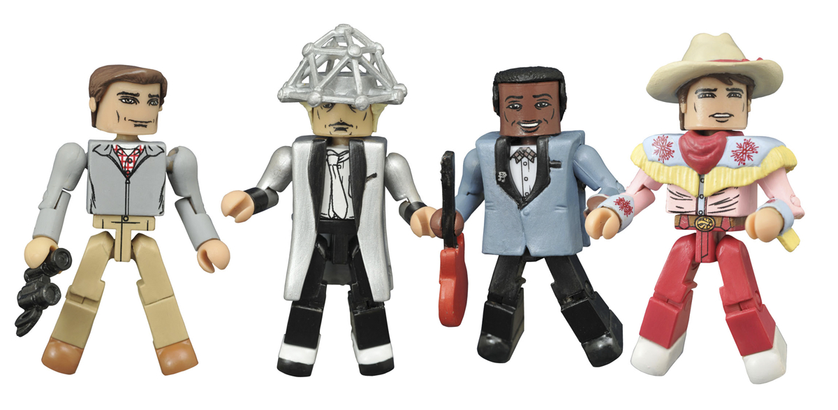 A Diamond Select Toys Release! You know that new Minimates box set you were looking for? Well, listen to this! DST is going back to 1955 with their next BTTF Minimates set, featuring four never-before-made Minimates! Cowboy Marty comes with a tombstone and hatless hair, Casual Doc Brown comes with his dog Copernicus and the Brain Wave Analyzer, Young George McFly comes with binoculars, and the first-ever Marvin Berry figure comes with a guitar and non-injured hand! Each Minimates mini-figures stands 2 inches tall with 14 points of articulation, and features fully interchangeable parts. Packaged in a full-color blister card.