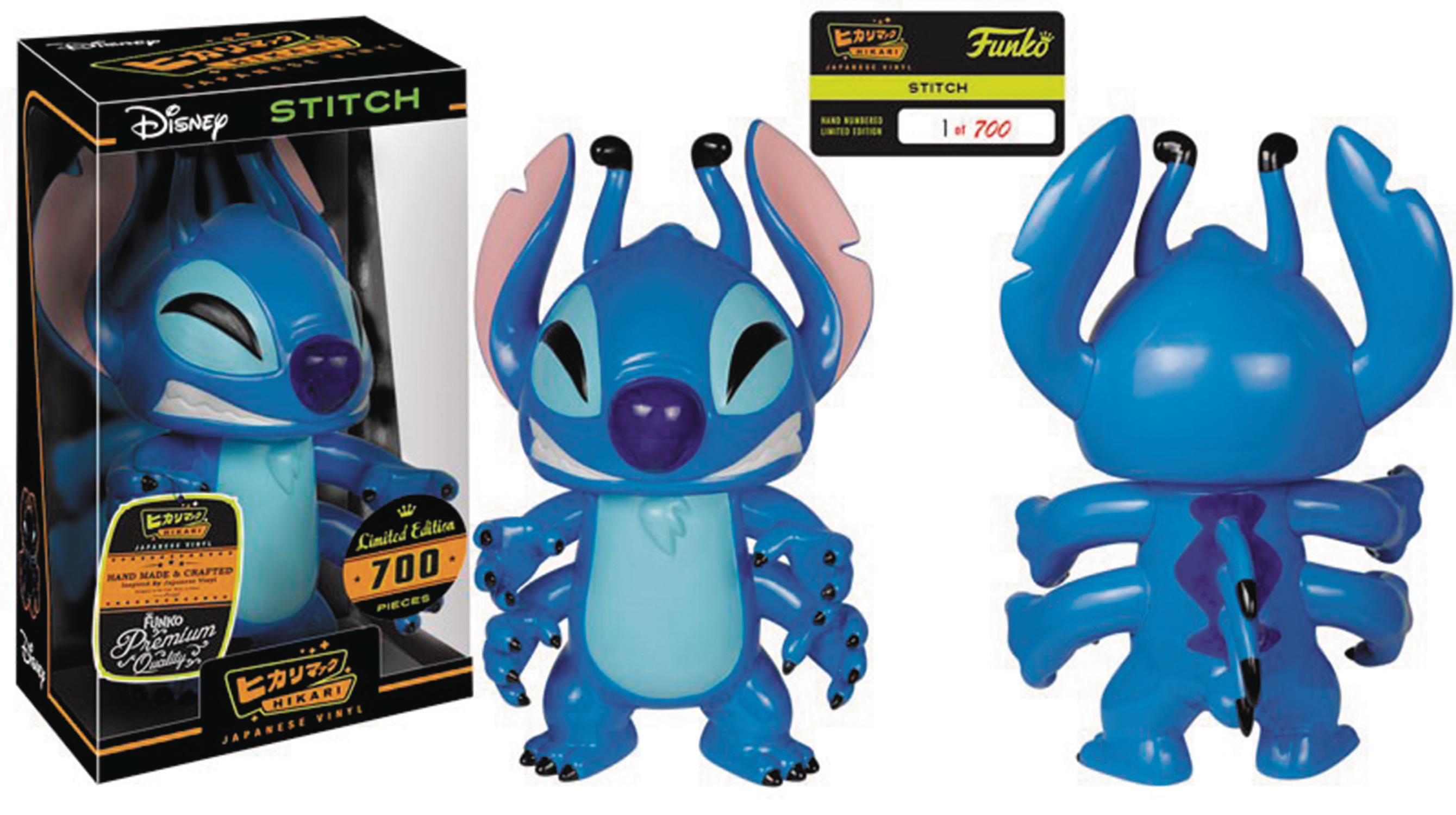 Sofubi Vinyl Figures. Each figure will be ultra-limited and will include a hand numbered card to prove authenticity and rarity. Everyone's favorite animated mad science experiment, Stitch, is ready to embrace you as a vinyl sofubi measuring approximately 9" tall. A limited edition of 700 pieces. Window box packaging.