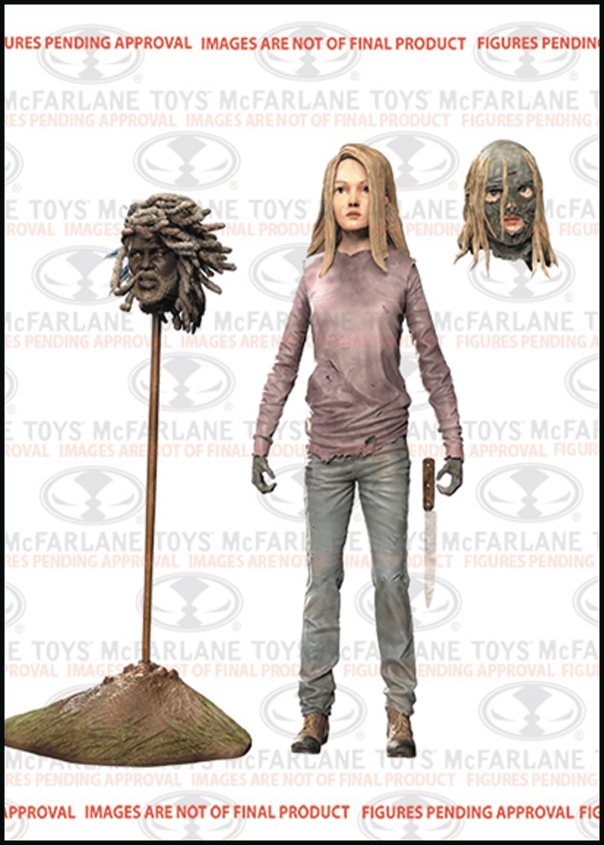 Lydia comes dressed in her walker hide, a key attire to the Whisperers, and includes an alternate walker hide head, a knife, and a severed Ezekiel head on a stake with base, an homage to the recent events in the comic.