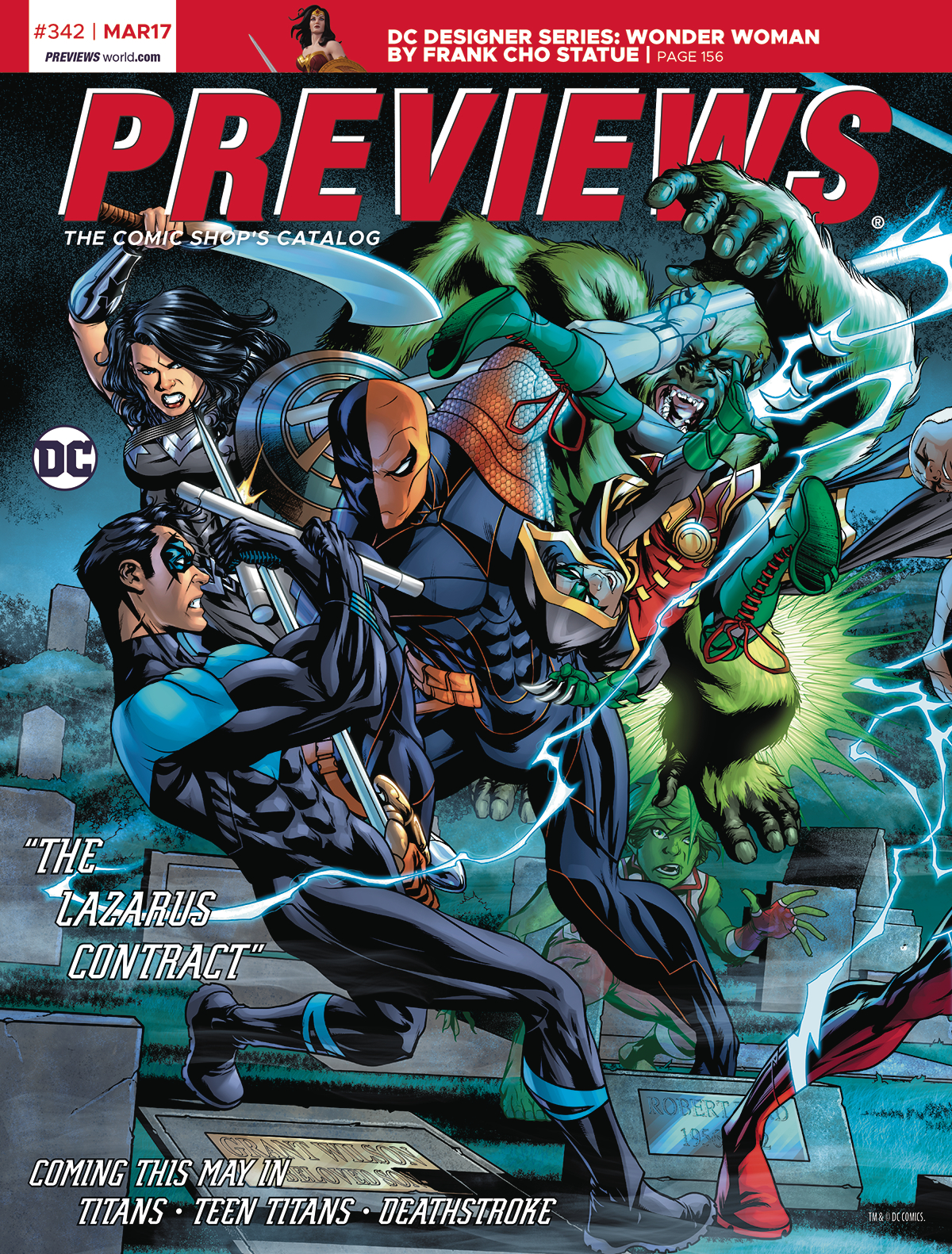 PREVIEWS is your ultimate guide to comics, graphic novels and pop-culture merchandise available from your local comic book shop... revealed up to 2 months in advance! Read detailed product descriptions and storylines for hundreds comic books and graphic novels from the top comic book publishers; see the coolest toys and pop-culture merchandise on Earth; plus PREVIEWS Exclusive items you'll find nowhere else! It's a great monthly read to find out what's at comic shops! This March issue features items scheduled to ship in May 2017 and beyond.