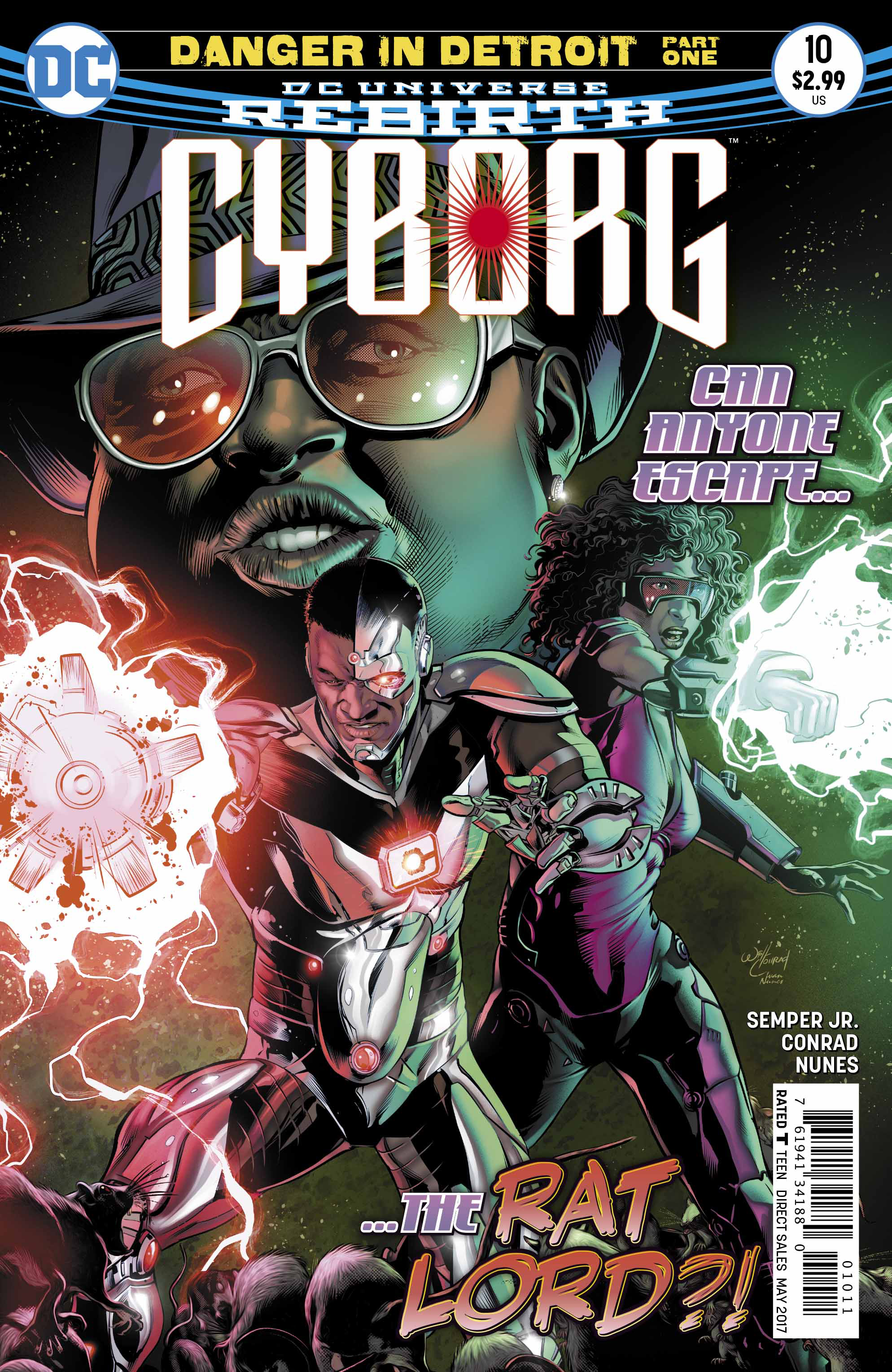 "LORD OF THE RATS" part one! Cyborg's gone to ground following the crippling malfunction of his tech at the hands of the corrupted S.T.A.R. Labs. Desperate to find his prey, the techno-villain posing as Vic Stone's father conspires with the Lord of Rats, a Detroit crime lord who agrees to hunt down Cyborg in exchange for OTAC transforming his rodent drug distribution force into a cybernetic rat army.