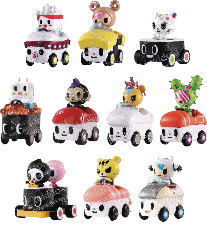 Take a ride with Tokidoki! This yummy new blind box collection features some of Tokidoki's most iconic characters behind the wheel of unique sushi-themed roadsters. There are 10 possible vehicles, so dig in and start collecting today!