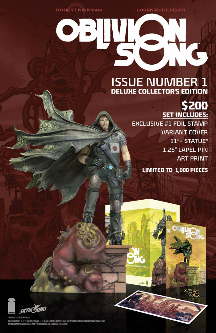 This collector's edition of the DEBUT issue of OBLIVION SONG features an exclusive limited edition variant cover by LORENZO DE FELICI! It comes with a STATUE (11") based on the cover to OBLIVION SONG #1, an exclusive print, and a collector's pin. These items will ONLY be available in this limited edition set (limited to 1,000).