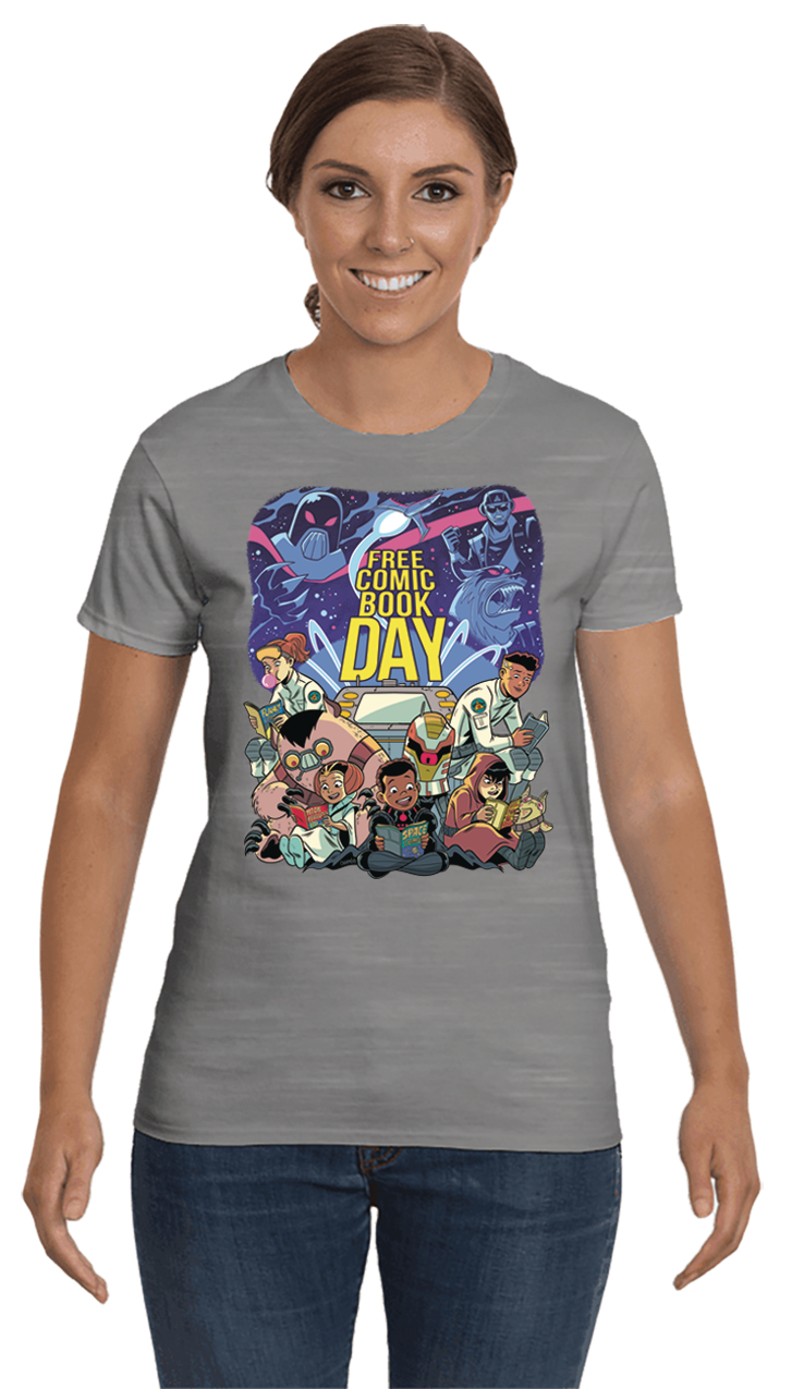May the 4th Be With You this Free Comic Book Day! Celebrate FCBD 2019 in style with this Star Wars-inspired design by Eisner Award winning artist Derek Charm. Whether you're at the local comic shop, at home relaxing on the couch, or chilling on a space station far, far away, everyone loves to read and enjoy comics! Available in Mens, Womens, and Youth sizes in either heather gray or black.