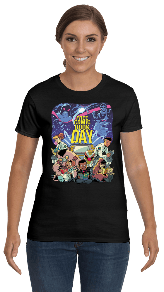 May the 4th Be With You this Free Comic Book Day! Celebrate FCBD 2019 in style with this Star Wars-inspired design by Eisner Award winning artist Derek Charm. Whether you're at the local comic shop, at home relaxing on the couch, or chilling on a space station far, far away, everyone loves to read and enjoy comics! Available in Mens, Womens, and Youth sizes in either heather gray or black.