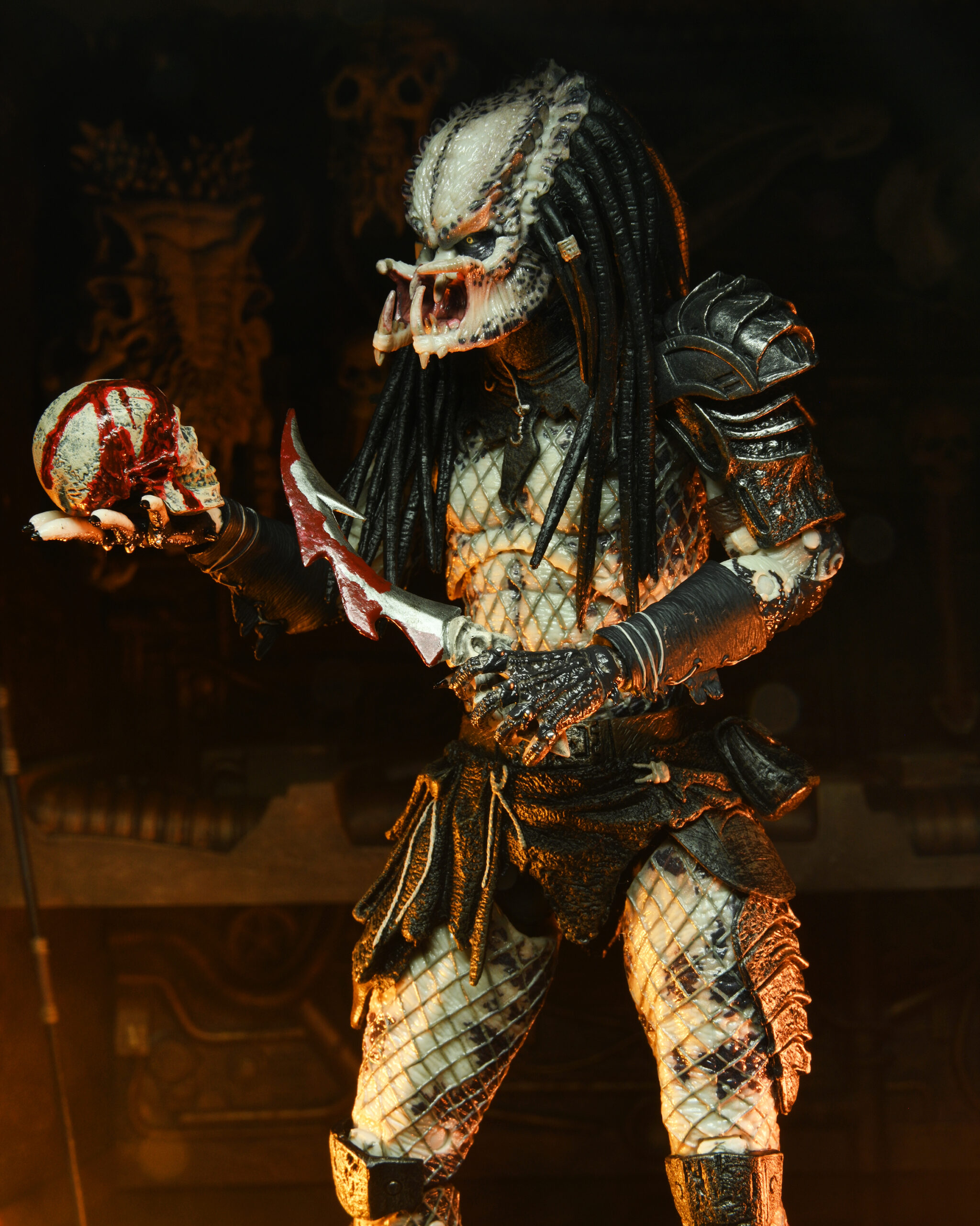 Predator 2, detective Mike Harrigan encounters more members of the Lost Tribe, including a mysterious Predator who carries a distinctive staff. Includes cloak, staff, bone necklace, ritual dagger, open throwing disc, human skull, hatcheted skull, masked and unmasked heads, plus interchangeable hands. Collector-friendly window box packaging with opening front flap.