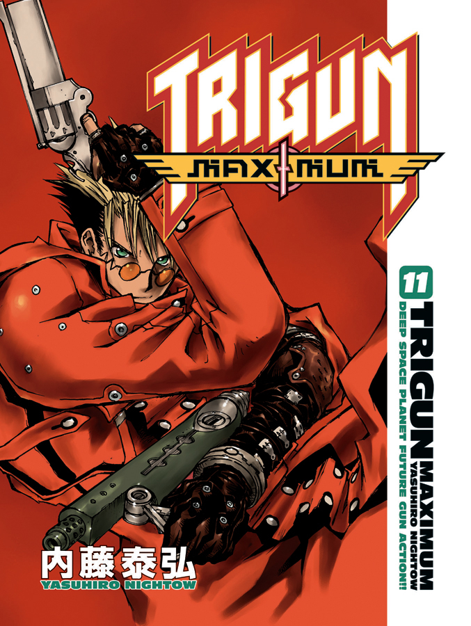 With so many intense scenes and watershed moments taking place in volume eleven of Trigun Maximum, it's next to impossible to write descriptive solicitation text. But readers have come to expect excellent action coupled with dramatic tension and timely comic relief from Yasuhiro Nightow, and volume eleven exceeds expectations. This volume is titled "Zero Hour." That means everything is climbng steadily to a crescendo, and you won't want to miss what lies in store for the people of the planet Gunsmoke.