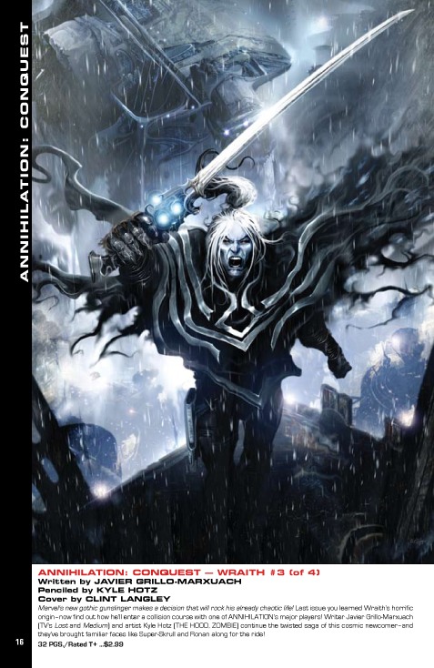 Marvel's new gothic gunslinger makes a decision that will rock his already chaotic life! Last issue you learned Wraith's horrific origin-now find out how he'll enter a collision course with one of ANNIHILATION's major players! Writer Javier Grillo-Marxuach (TV's Lost and Medium) and artist Kyle Hotz (THE HOOD, ZOMBIE) continue the twisted saga of this cosmic newcomer-and they've brought familiar faces like Super-Skrull and Ronan along for the ride!