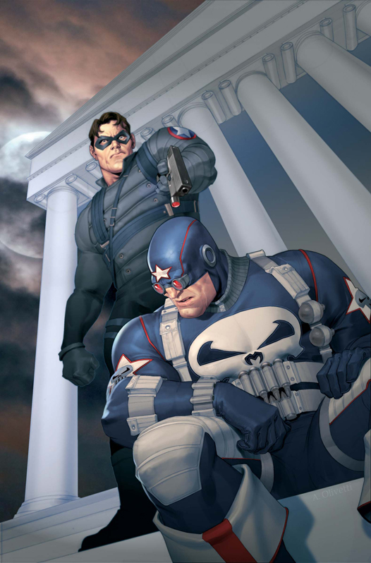 A handful of survivors and victims of our first year of stories converge for three wildly different confrontations, all setting in motion the explosive second year of PUNISHER WAR JOURNAL: In Washington DC, someone wants to have words with Frank about his recent patriotic costume change-- the Winter Soldier himself, Bucky Barnes! On a houseboat in the Florida Everglades, G.W. Bridge goes head-to-head with Tony Stark to negotiate the terms of his return to S.H.I.E.L.D.... or is it his surrender? And in a psychiatric hospital, Ian the Fake Cop Hero of Times Square has an epically strange chat with his epically unconventional therapist about... HEROES AND VILLAINS.